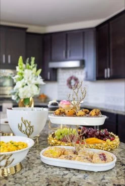 Description: This beautiful two-tiered cake stand is a great piece of elegant design. The gold textured details complement the glossy white ceramic to create a timeless look of sheer elegance and glam.