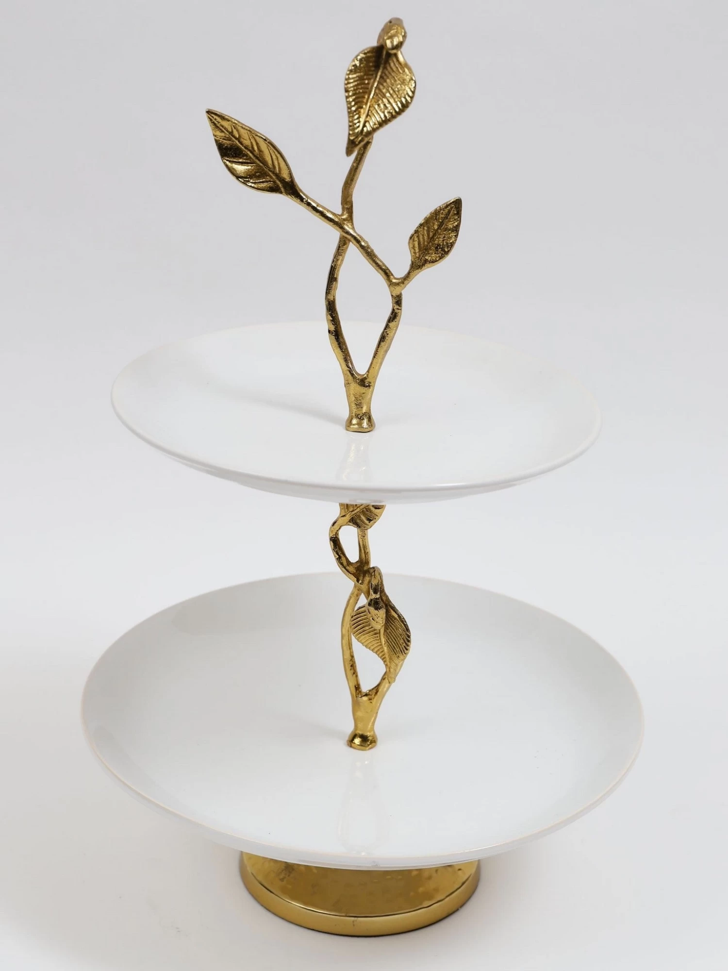 Description: This beautiful two-tiered serving tray is a great piece of elegant design. The gold leaves compliment the glossy white ceramic to create a timeless look of sheer elegance and glam.