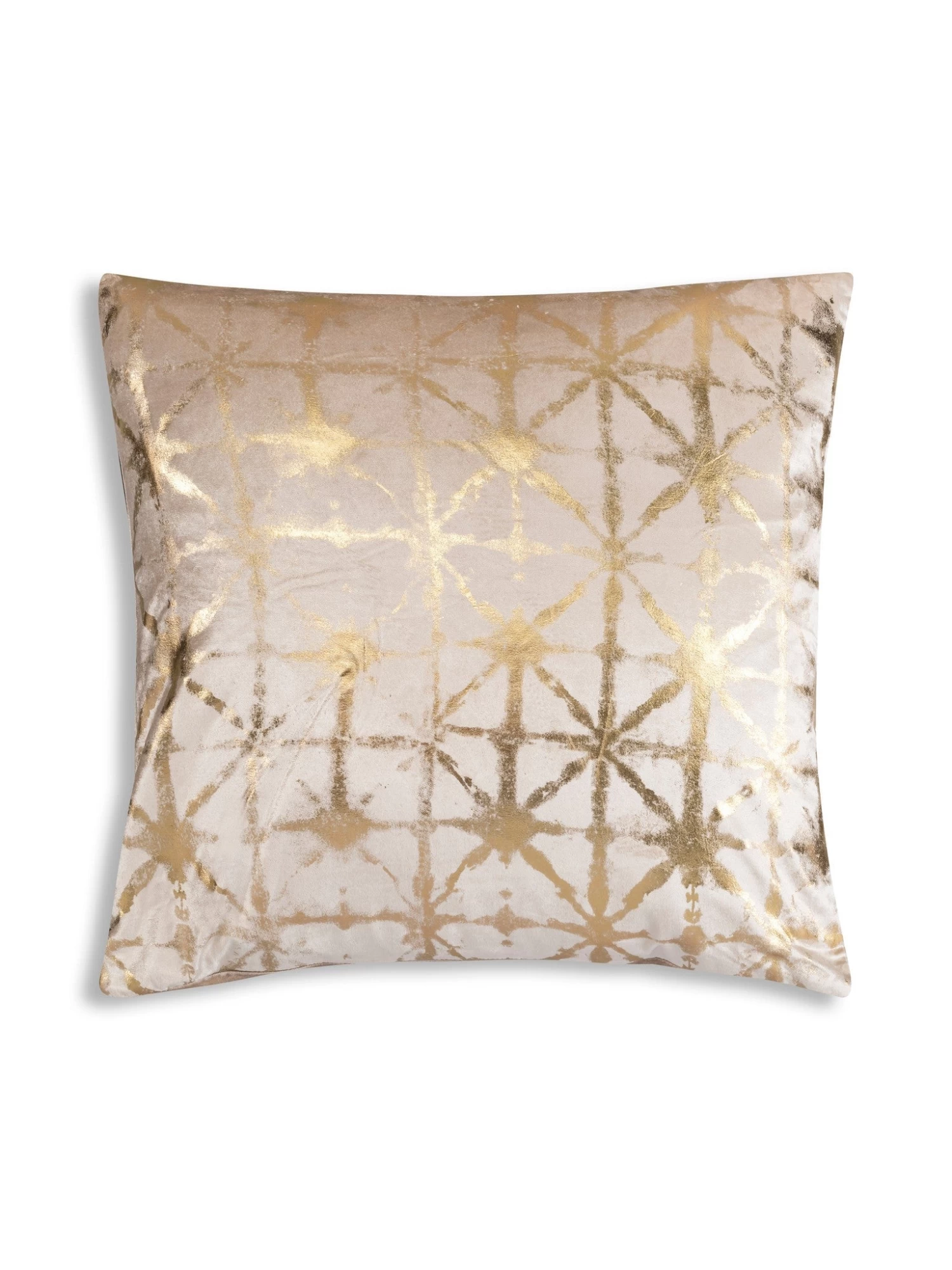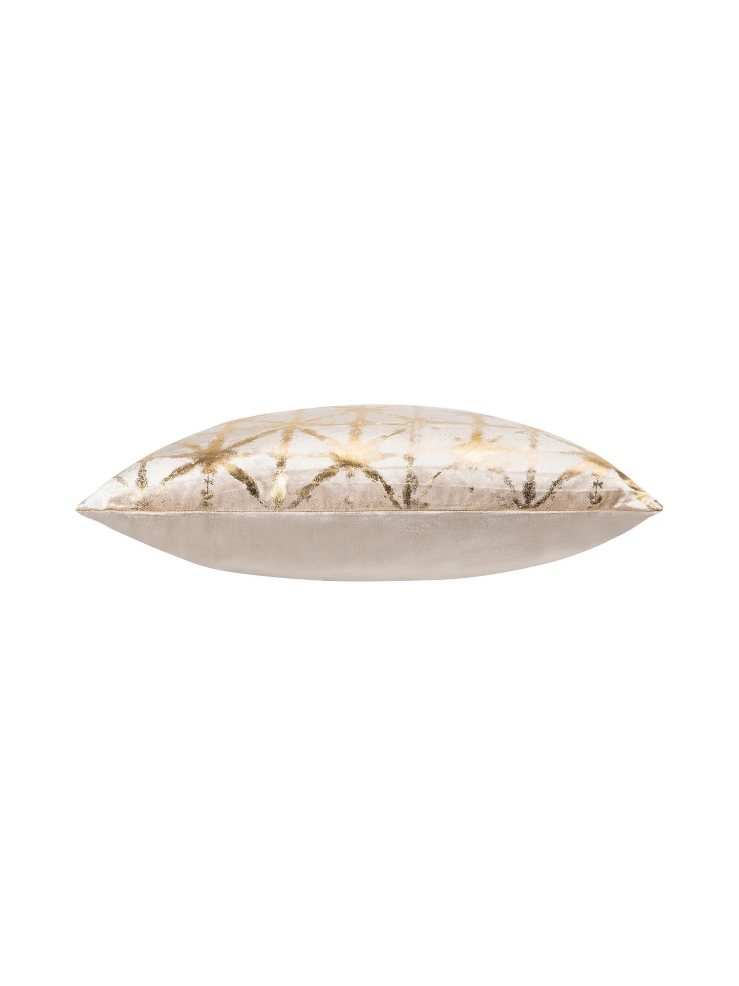 The Kora pillow features a geometric metallic foil print on a rich velvet fabric. This glamorous pillow will add glitz to any room when you decorate with it.