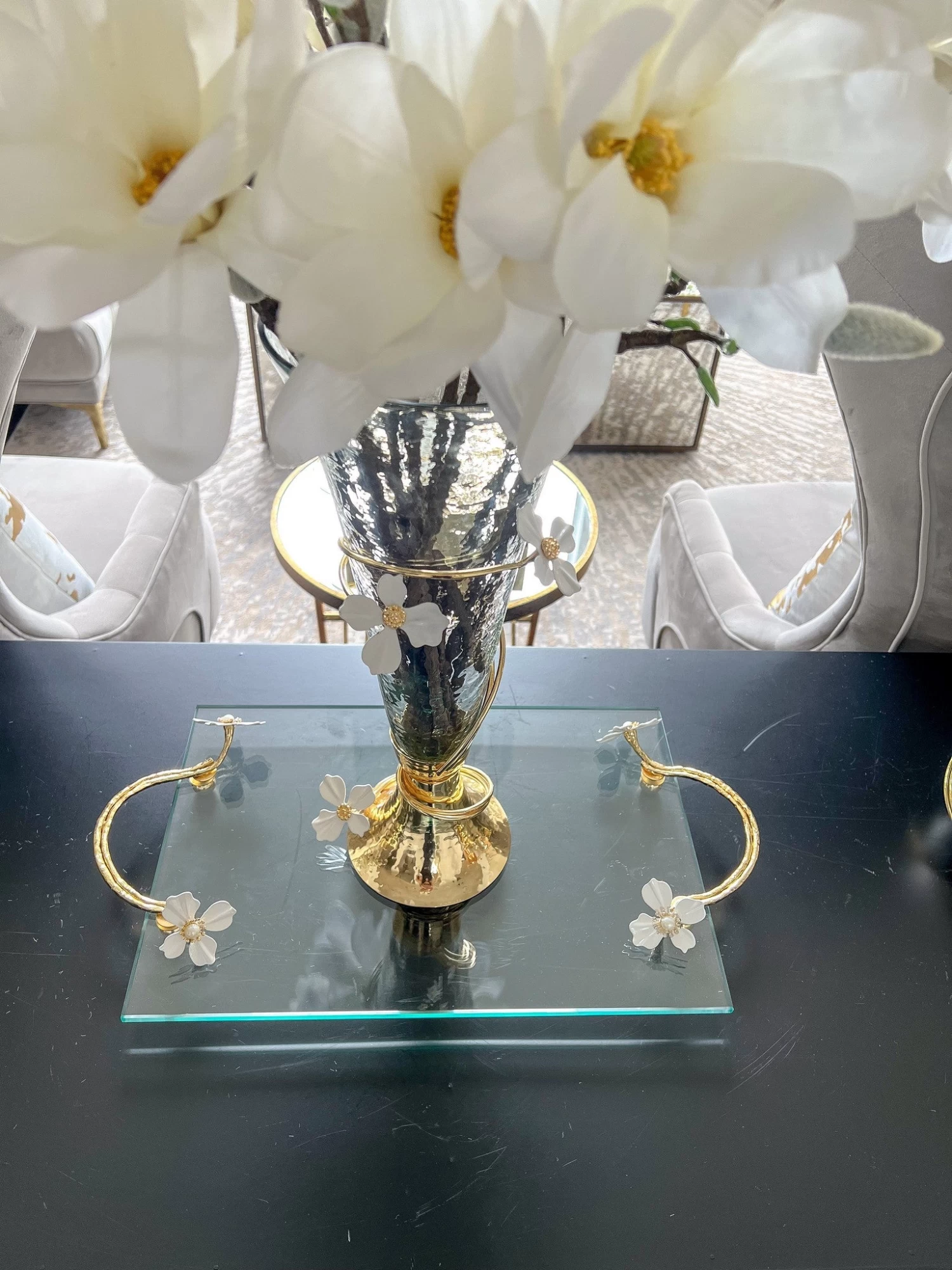 Description: This beautiful rectangular glass tray has stunning gold details with a white jeweled flower design!