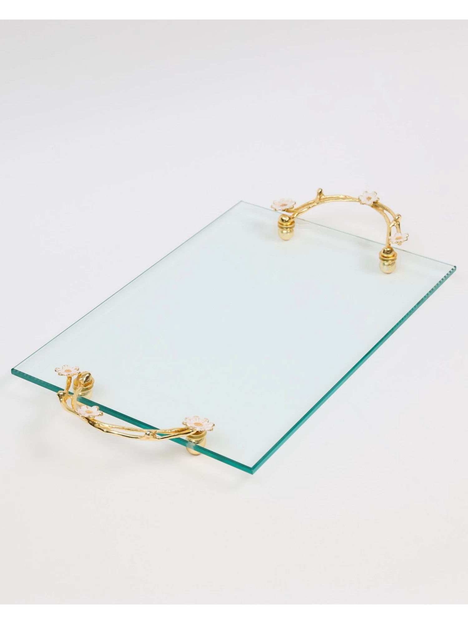 Description: This large rectangular glass tray has stunning gold detail and gold handles with a cherry blossom design!