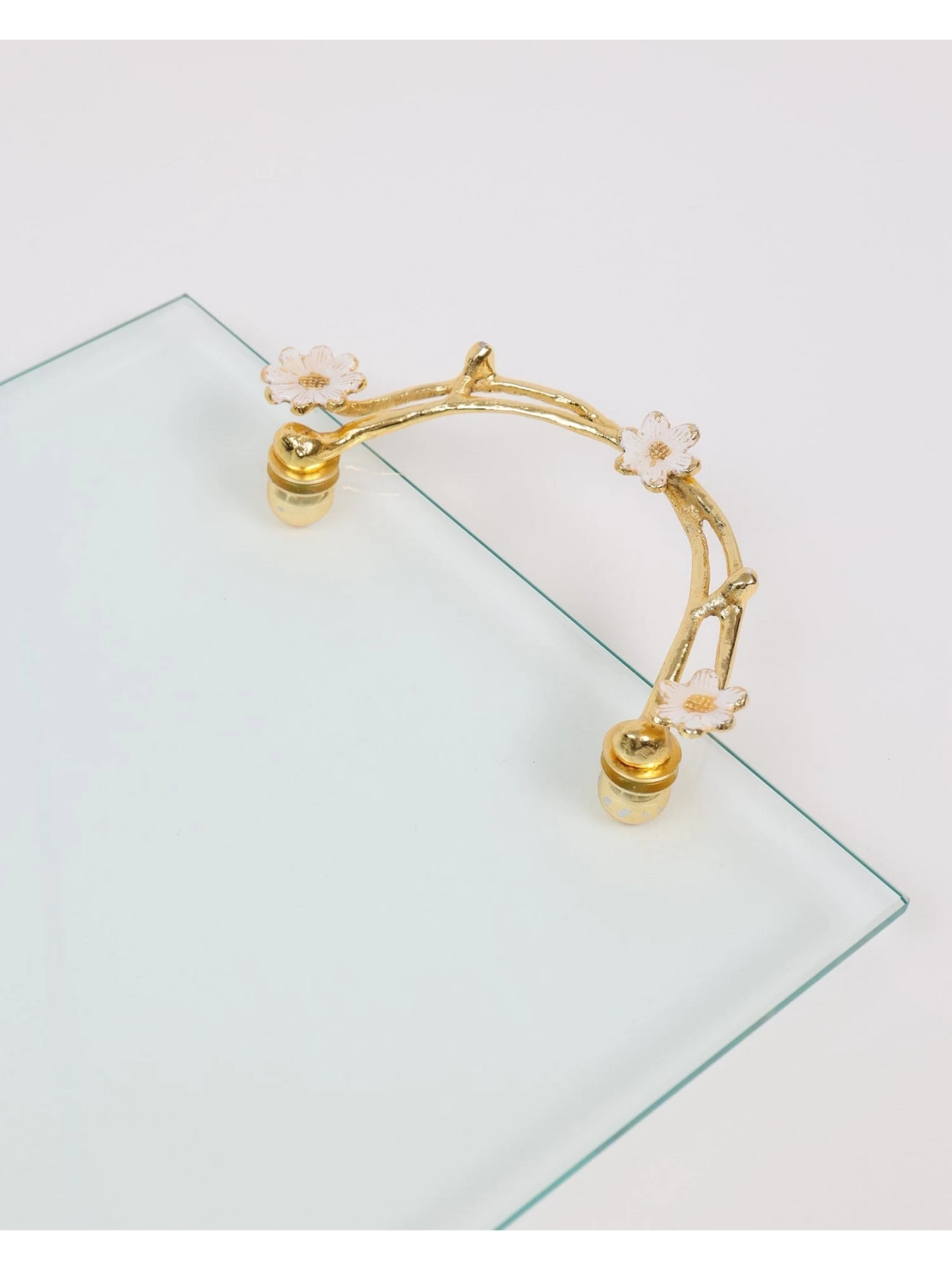 Description: This large rectangular glass tray has stunning gold detail and gold handles with a cherry blossom design!