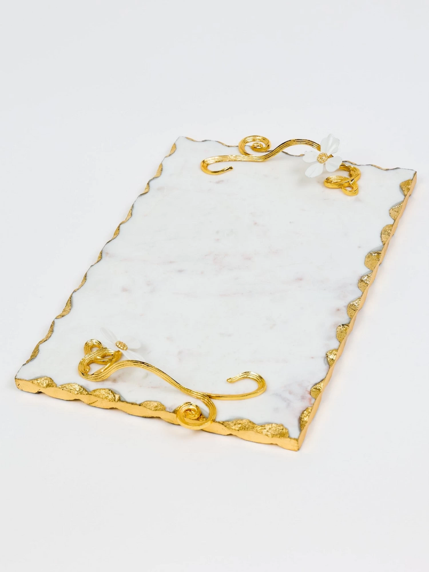 Description: This beautiful rectangular glass tray has stunning gold details and an intricately detailed handle with a white jeweled flower design!