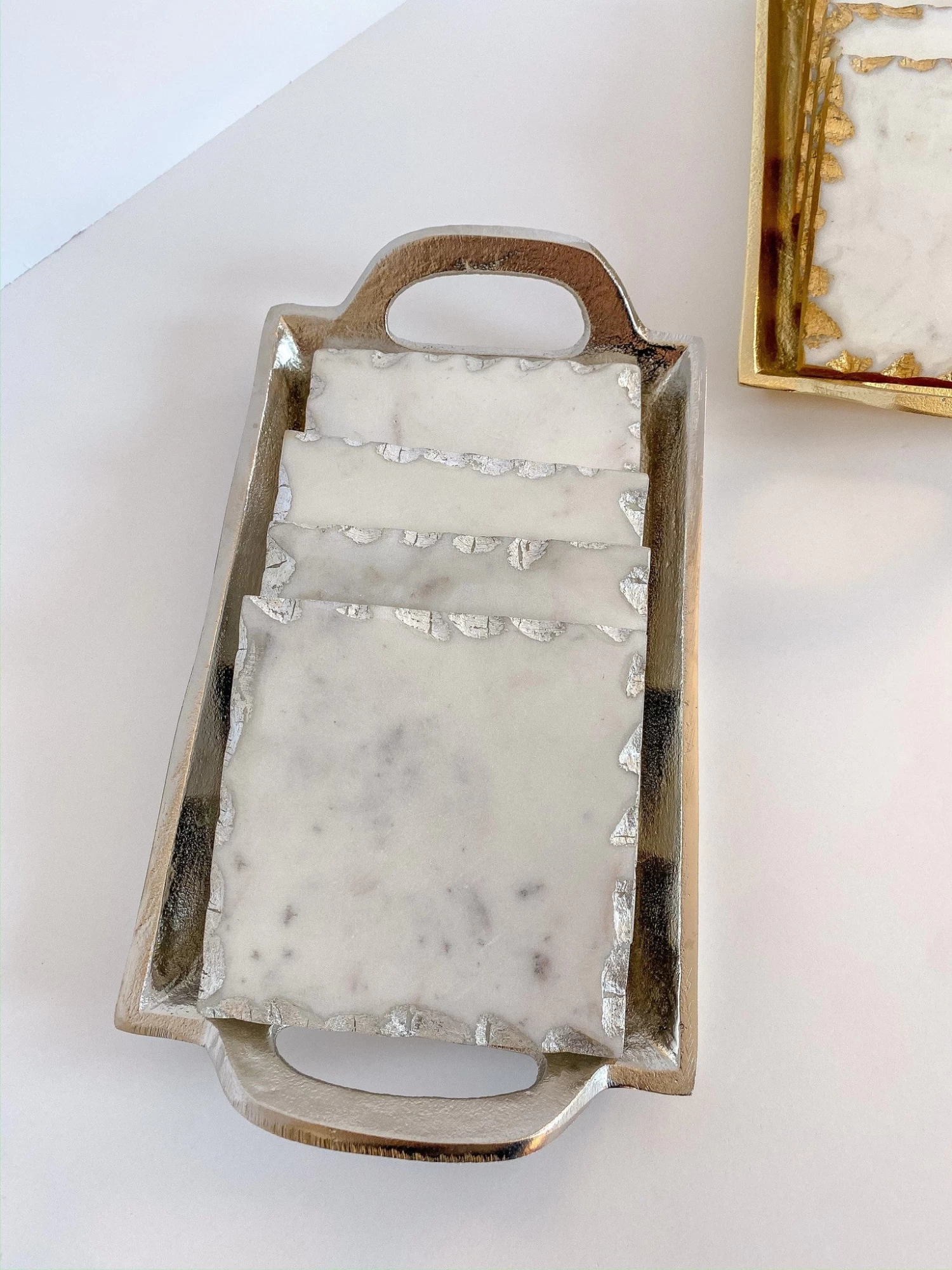 Description: Give your beverages a break with this gorgeous marble coasters! Available in silver and gold, and also features their own matching tray to display when not in use!
