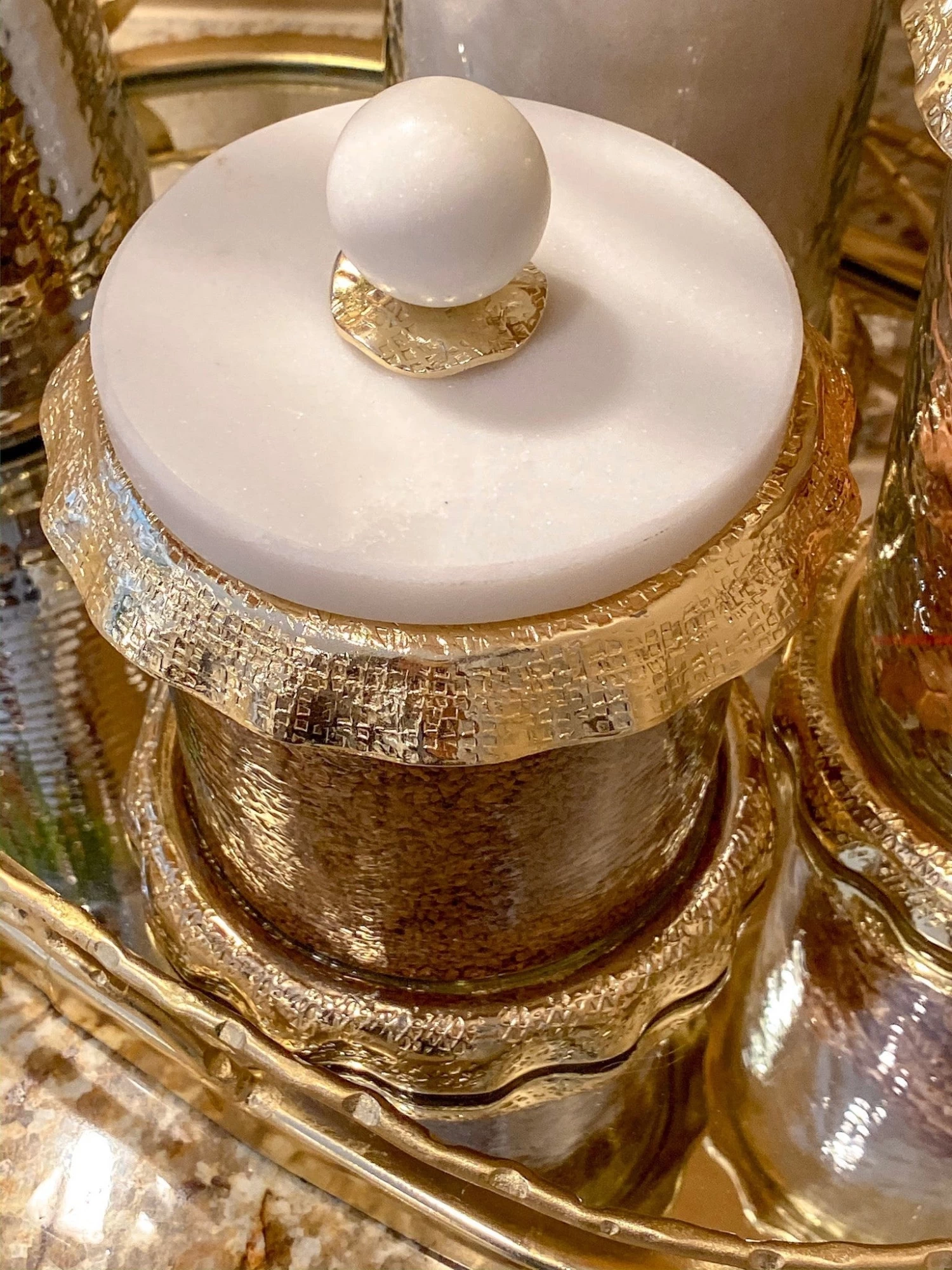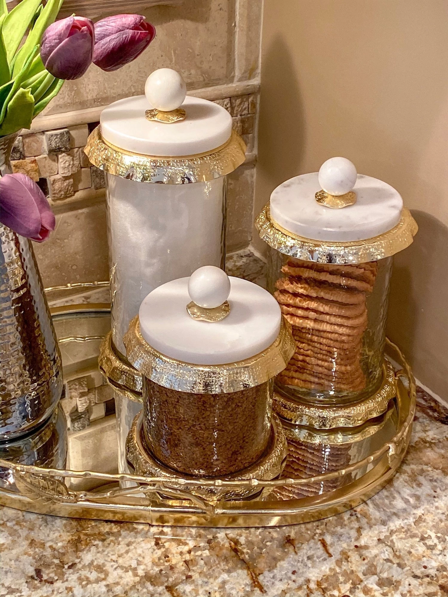 Description: They’re BACK!!! We have restocked our original classic marble and gold hammered canisters!