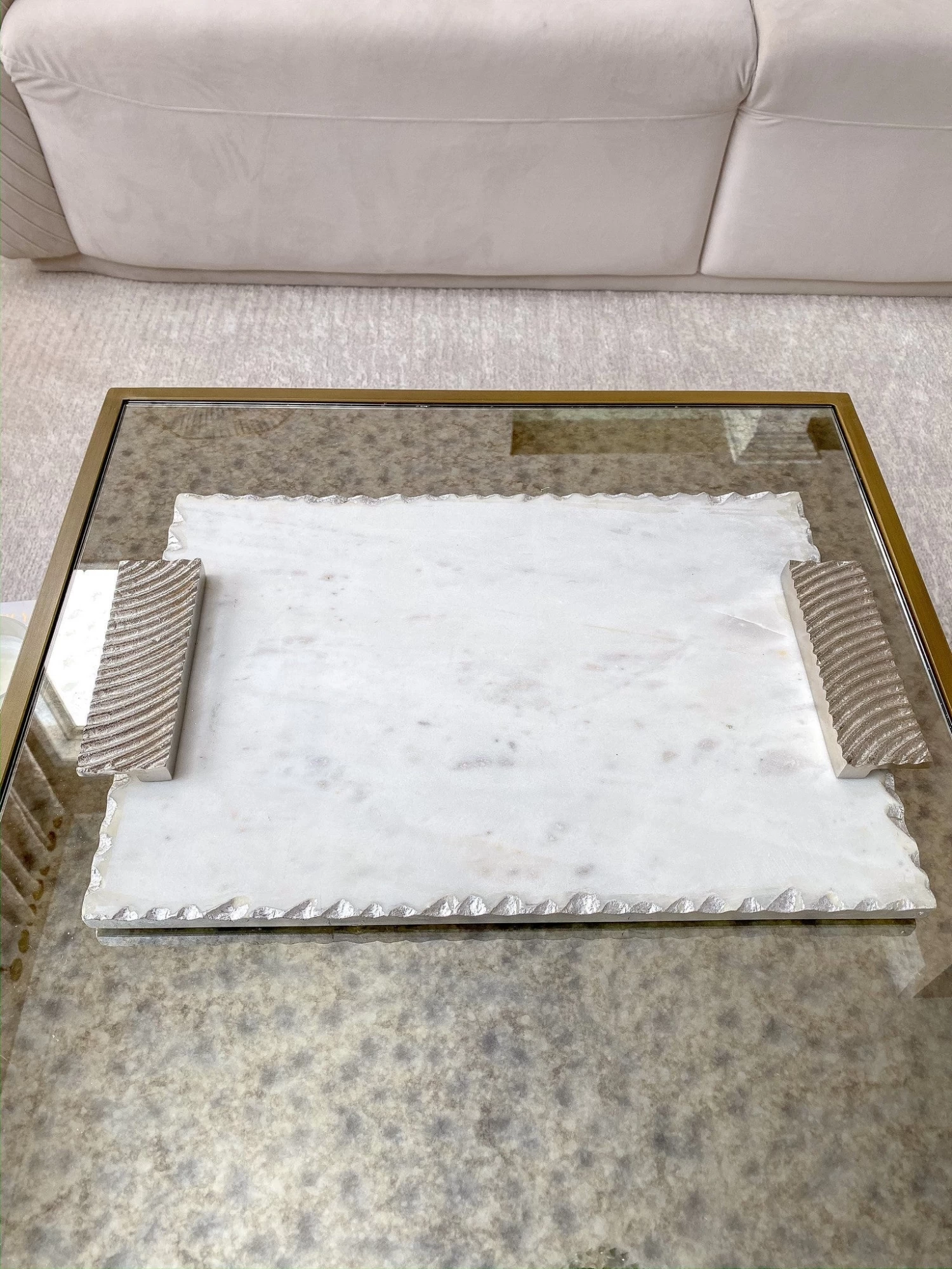 This beautiful marble tray is a simple must have statement in your home! Available in silver and gold, this piece features textured handles and a unique trim to make for a stunning piece!