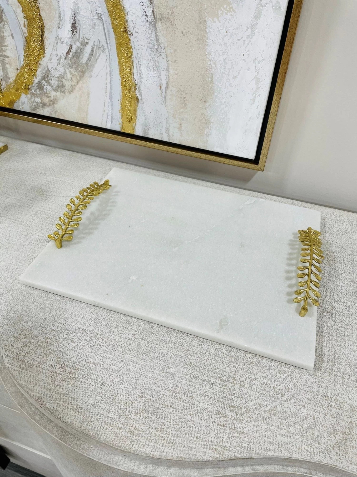 Description: This substantial marble tray features beautiful metal handles with a unique gold leaf pattern is from The Jasmine Collection. Use as a layering piece with your favorite IMHD ginger jar or a serving platter.