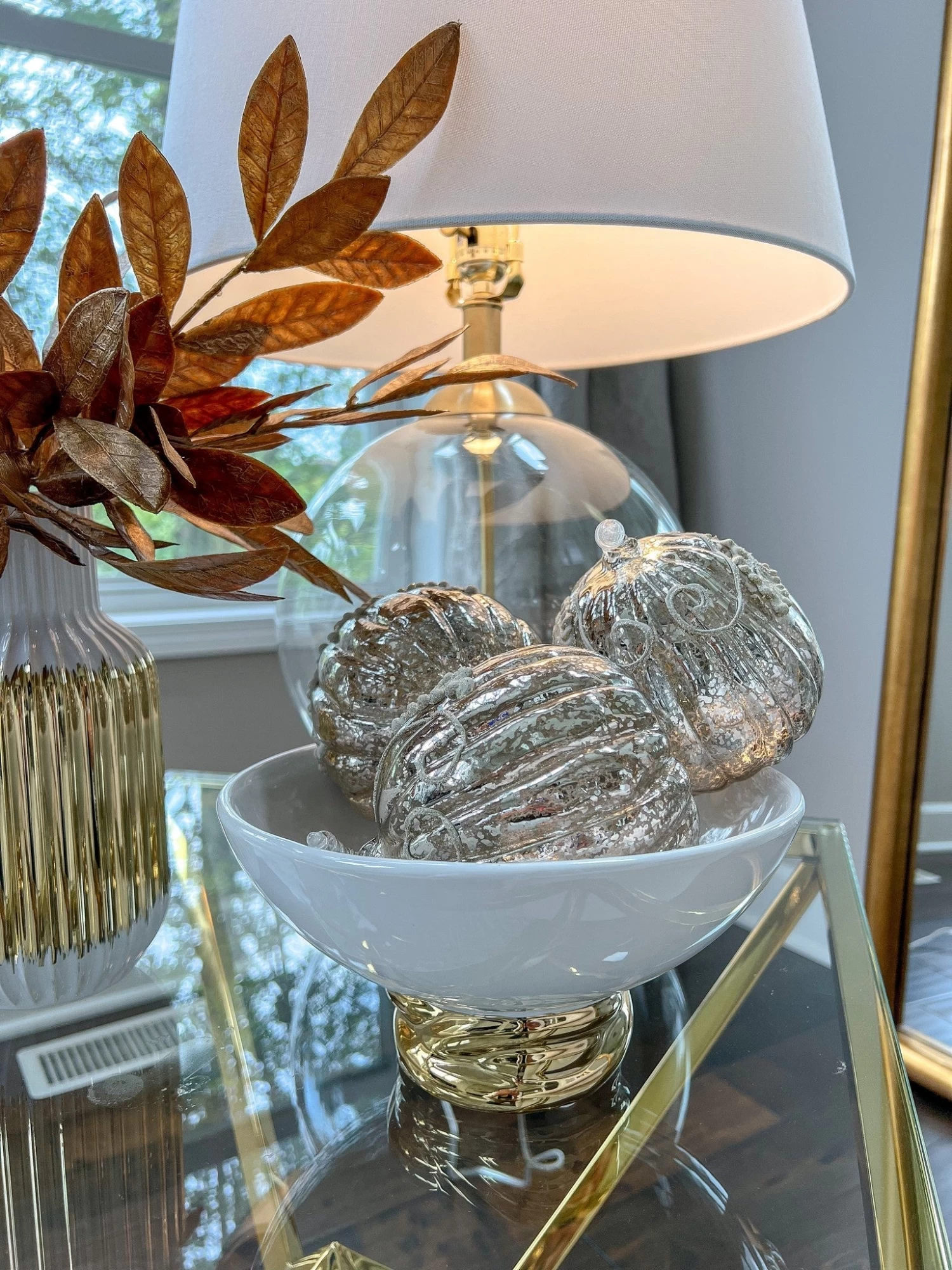 Description: This mercury glass pumpkin features details to make your fall decor glamourous!