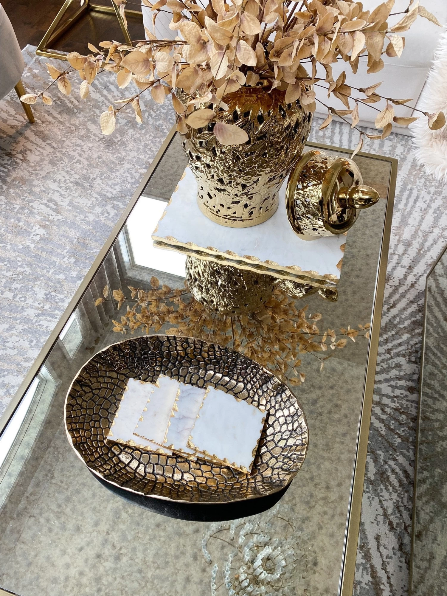 Description: This tray is the perfect accessory for any table! The bold gold crocodile pattern makes for an impressive presentation.