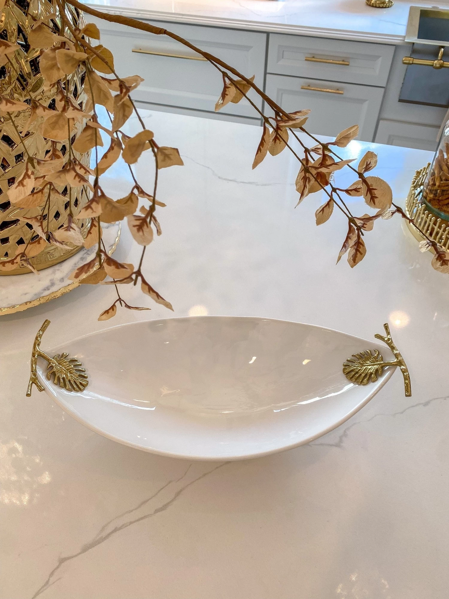 Description: This beautiful bowl is a great piece of elegant design. The gold leaves complement the glossy white ceramic to create a timeless look of sheer elegance and glam.