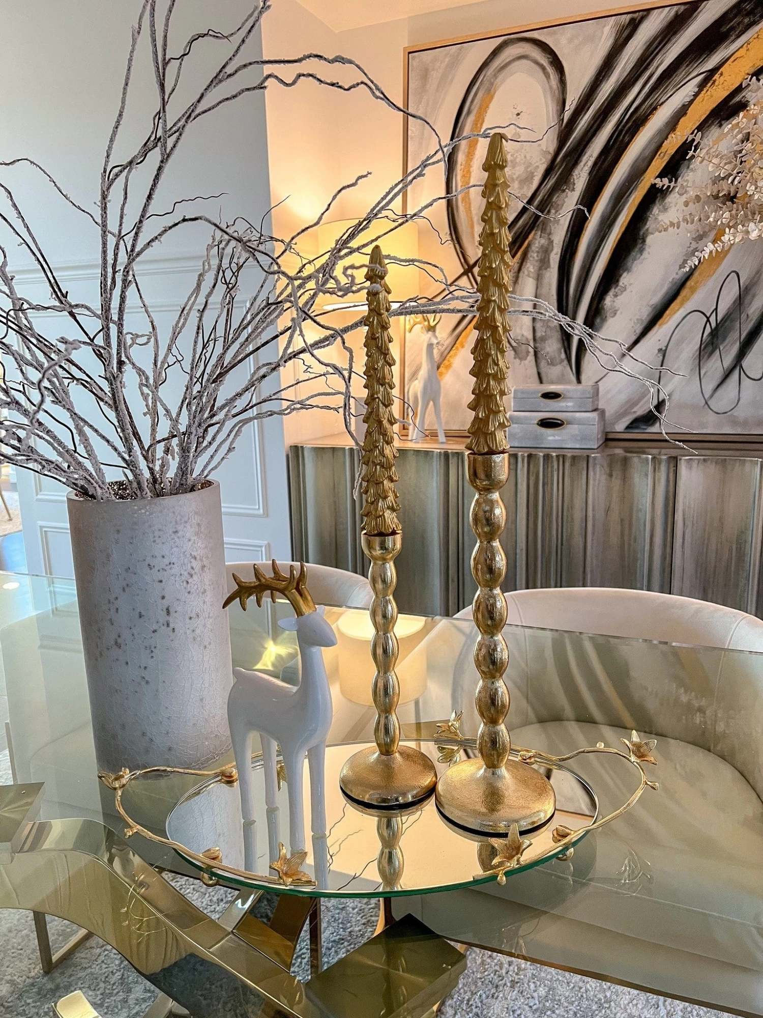 Description: This is a gorgeous oval mirror tray with stunning gold flower details and handles. This makes a great layering piece and a beautiful candle vignette. This would look great on your vanity.