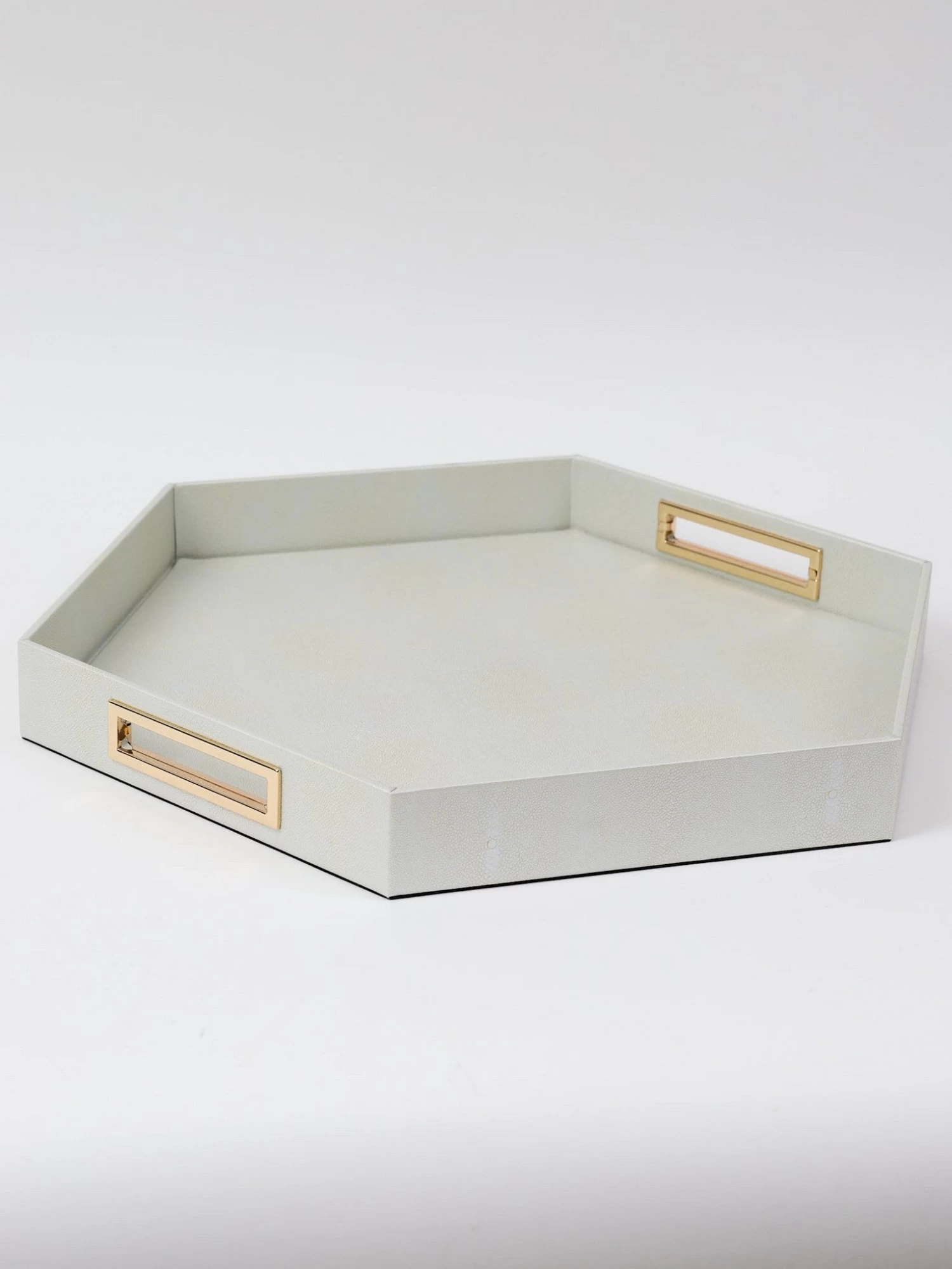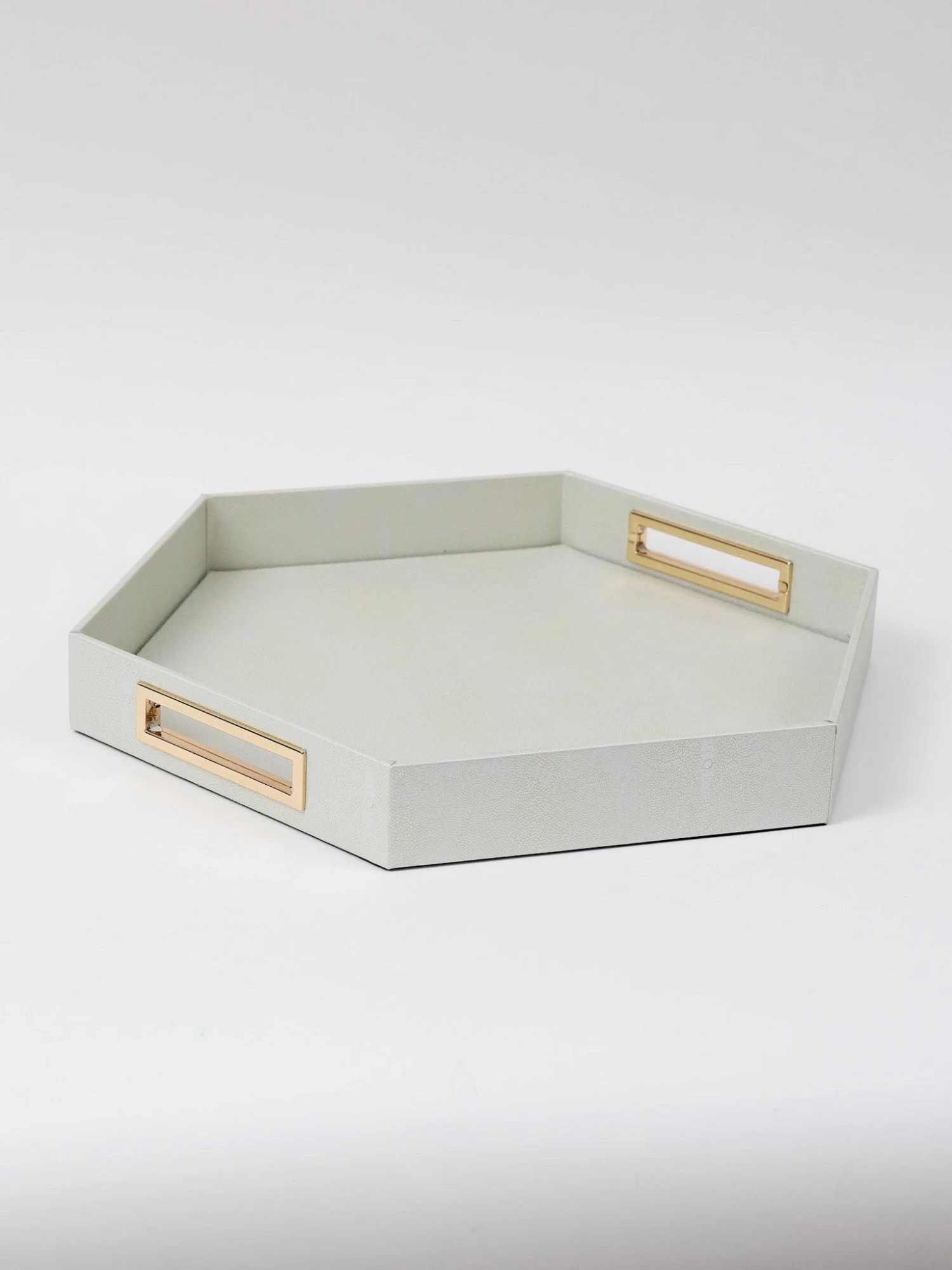 Description: These hexagon trays are so luxurious, they feature gold handle details and faux leather material.