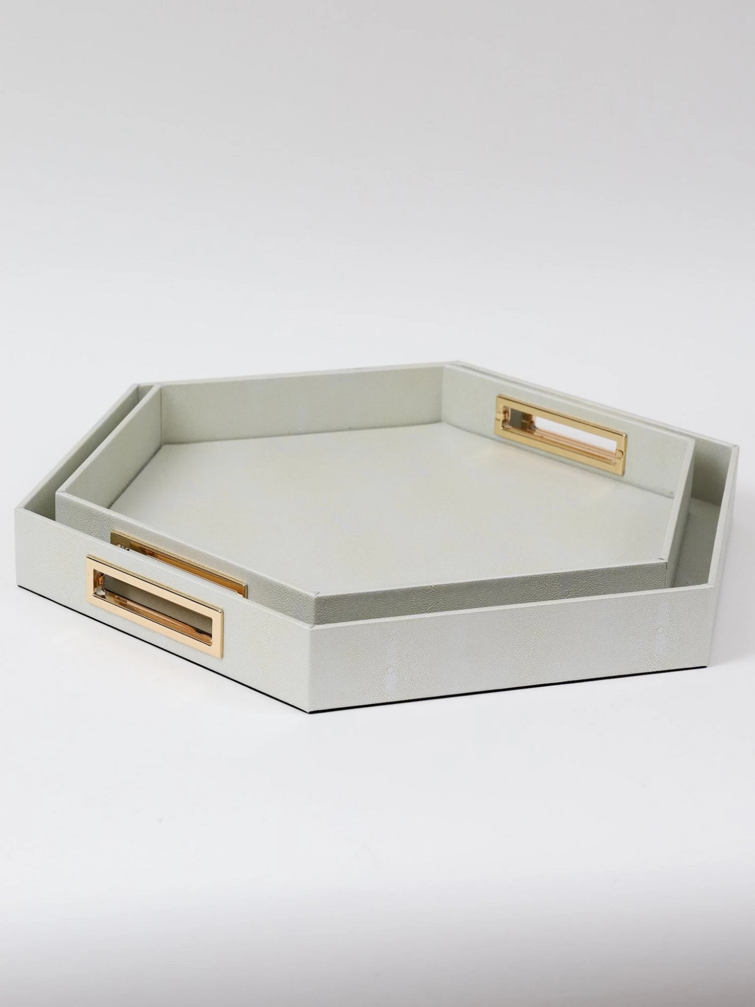 Description: These hexagon trays are so luxurious, they feature gold handle details and faux leather material.