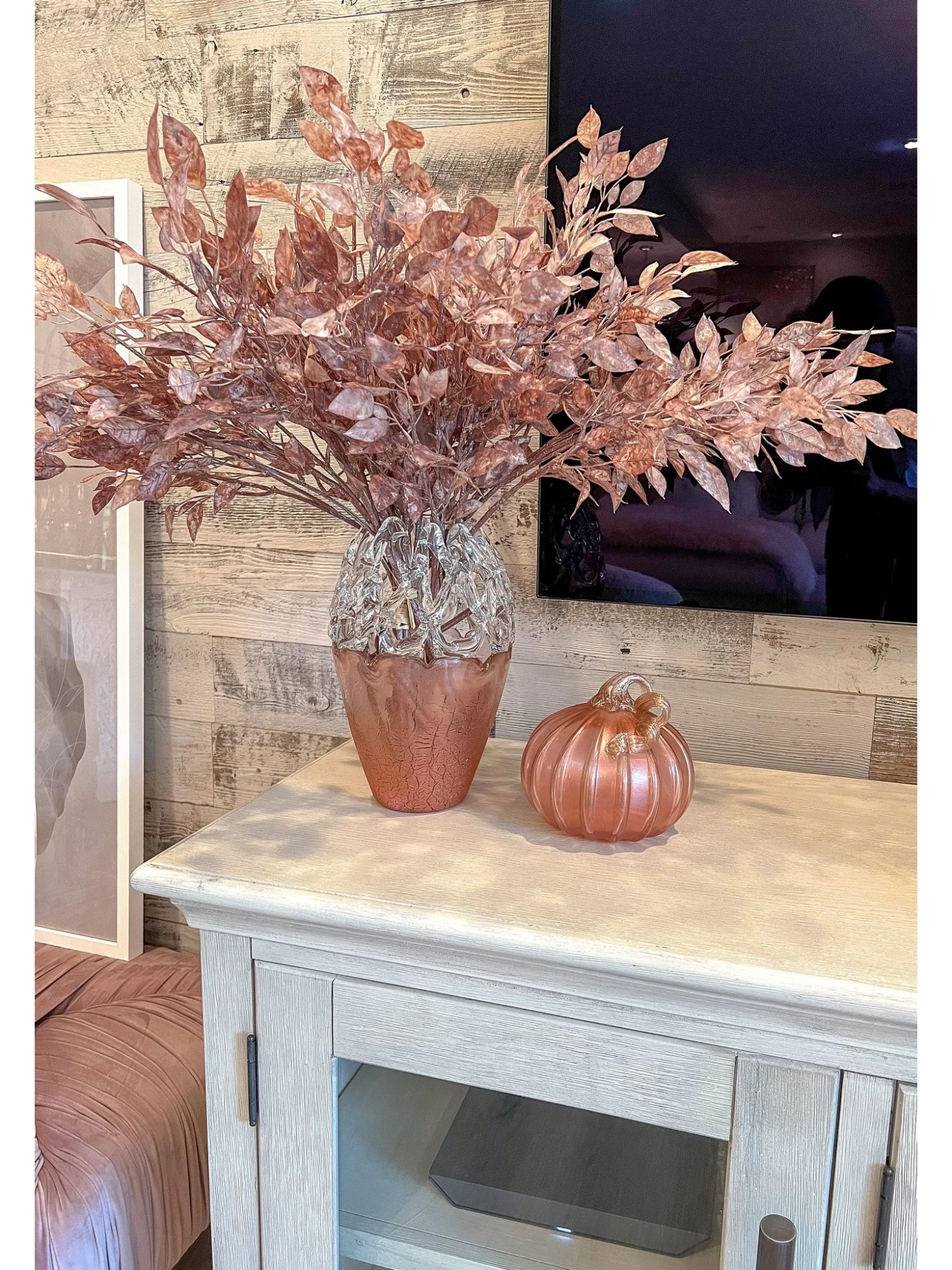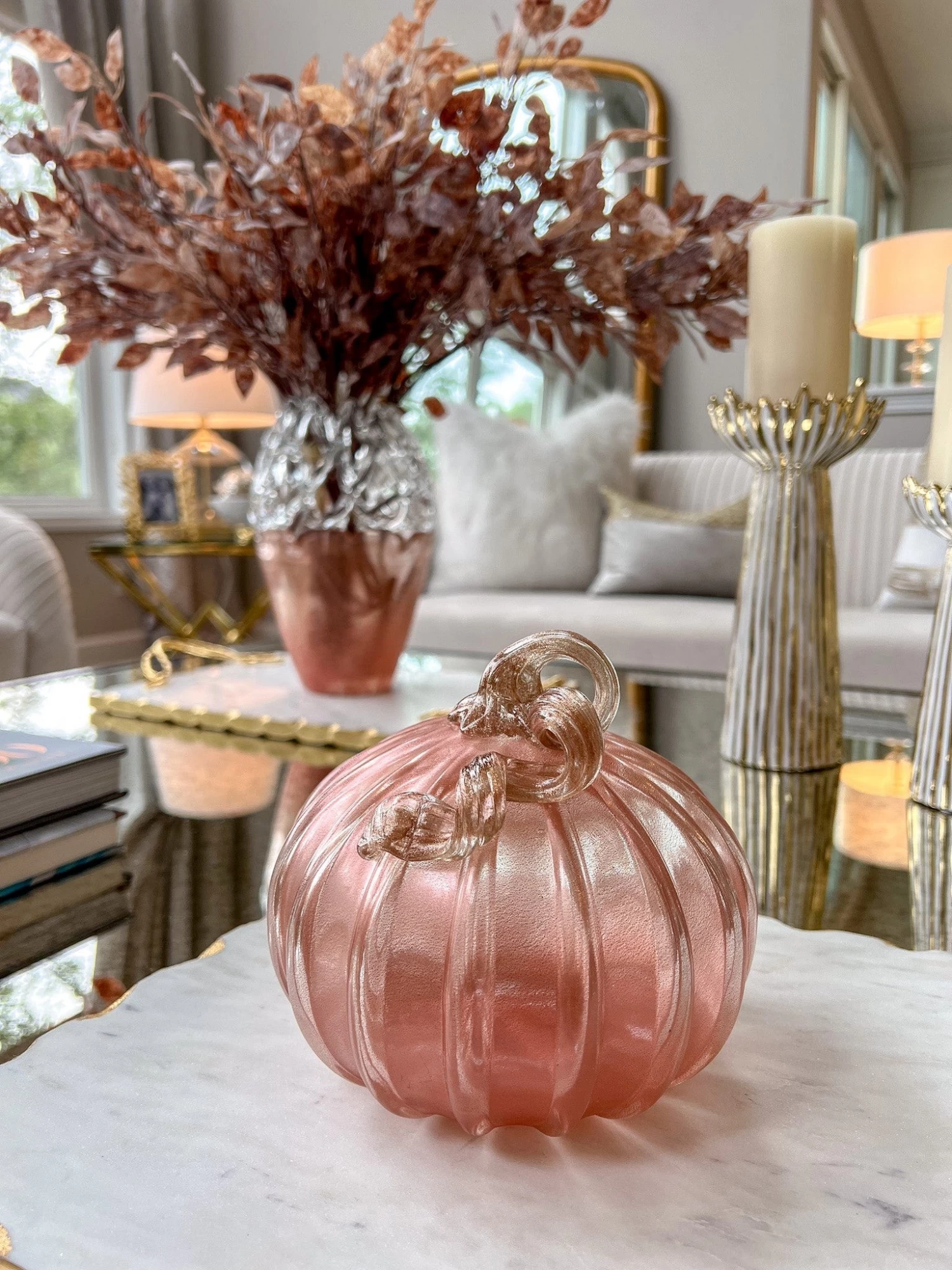 Description: This stunning pink glass pumpkin is simply gorgeous and will tie in perfectly with your fall decor!