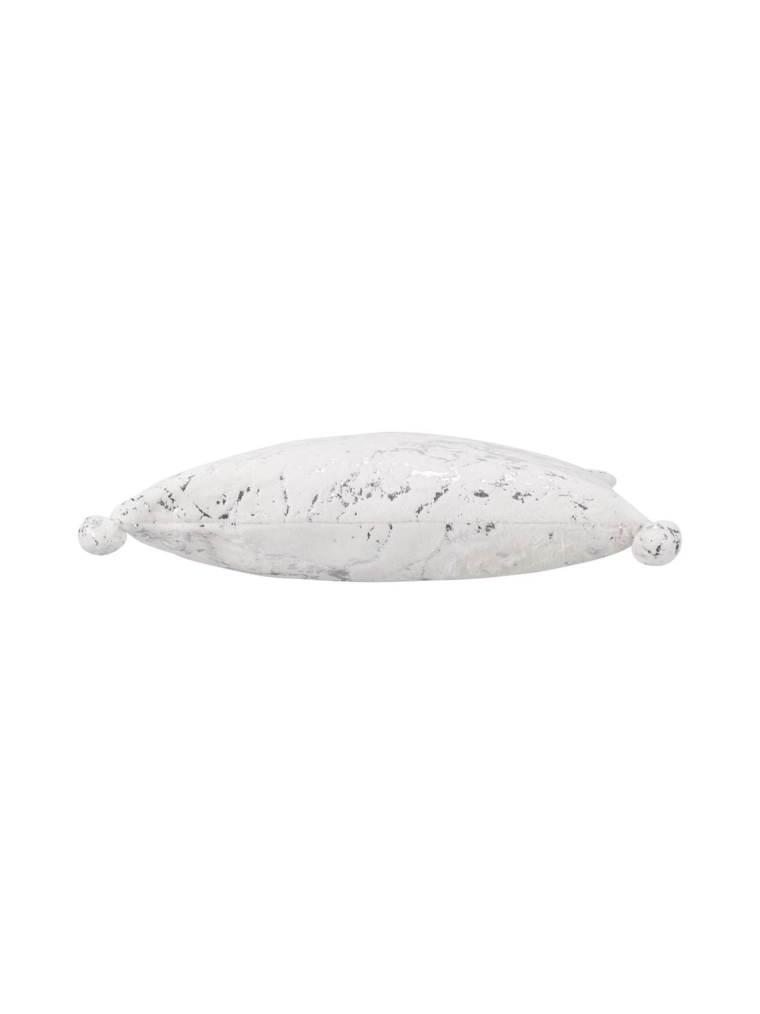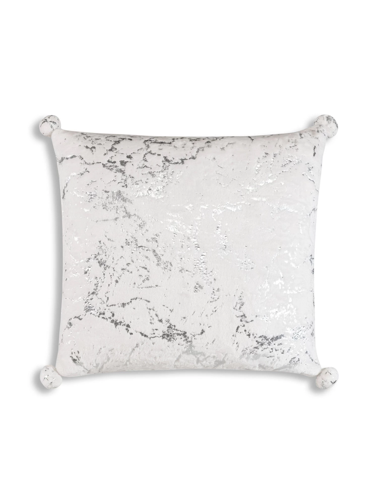 Faux fur pillow with silver printing and pom pom trim on the edges