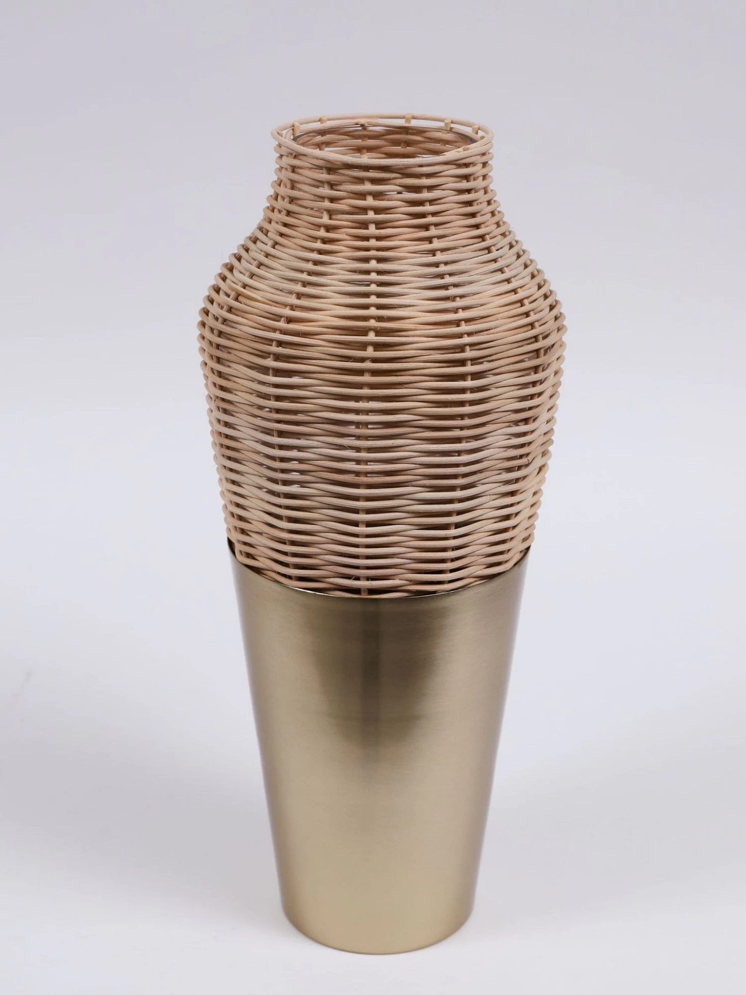 Description: This elegant vase is the perfect combination of rustic and glam! We love the textured detailed of the rattan wicker frame, and the way it is beautifully accented with a gold metal base! A glass insert is in the center of the vase so you can still use it to display your favorite florals with ease!