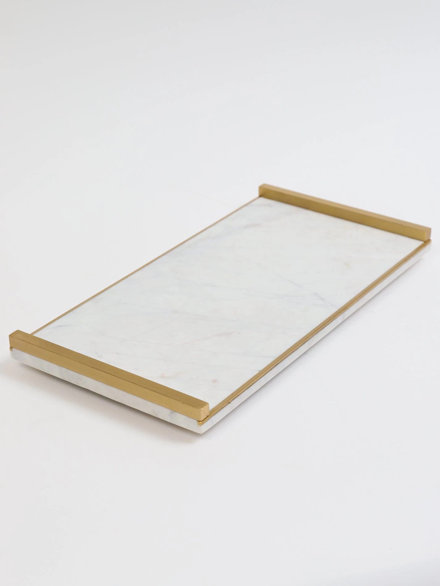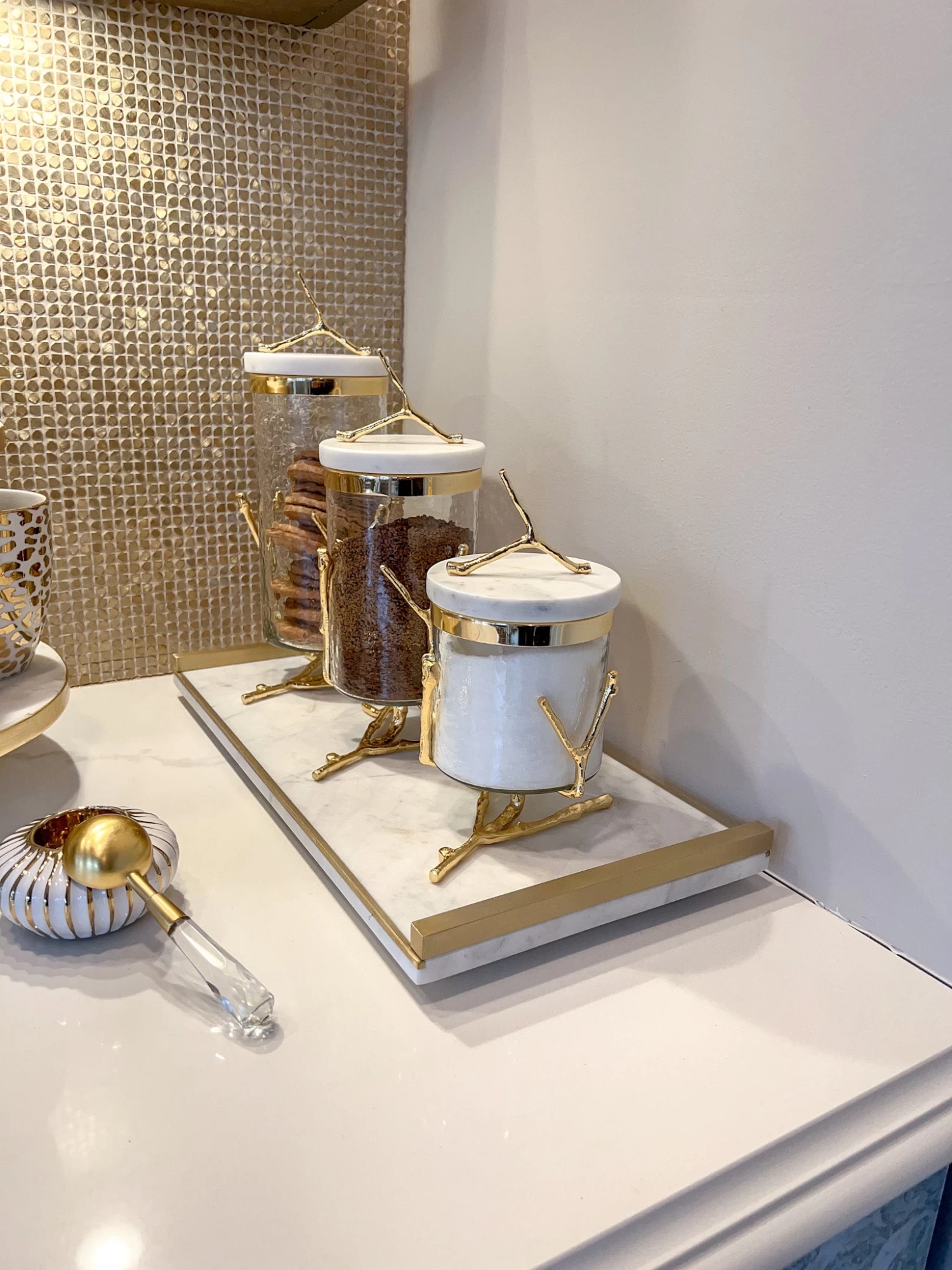 Description: This white marble tray features gold handles and a beautiful gold edge. It is simple yet elegant and very versatile in its use. Perfect to hold your canister sets!