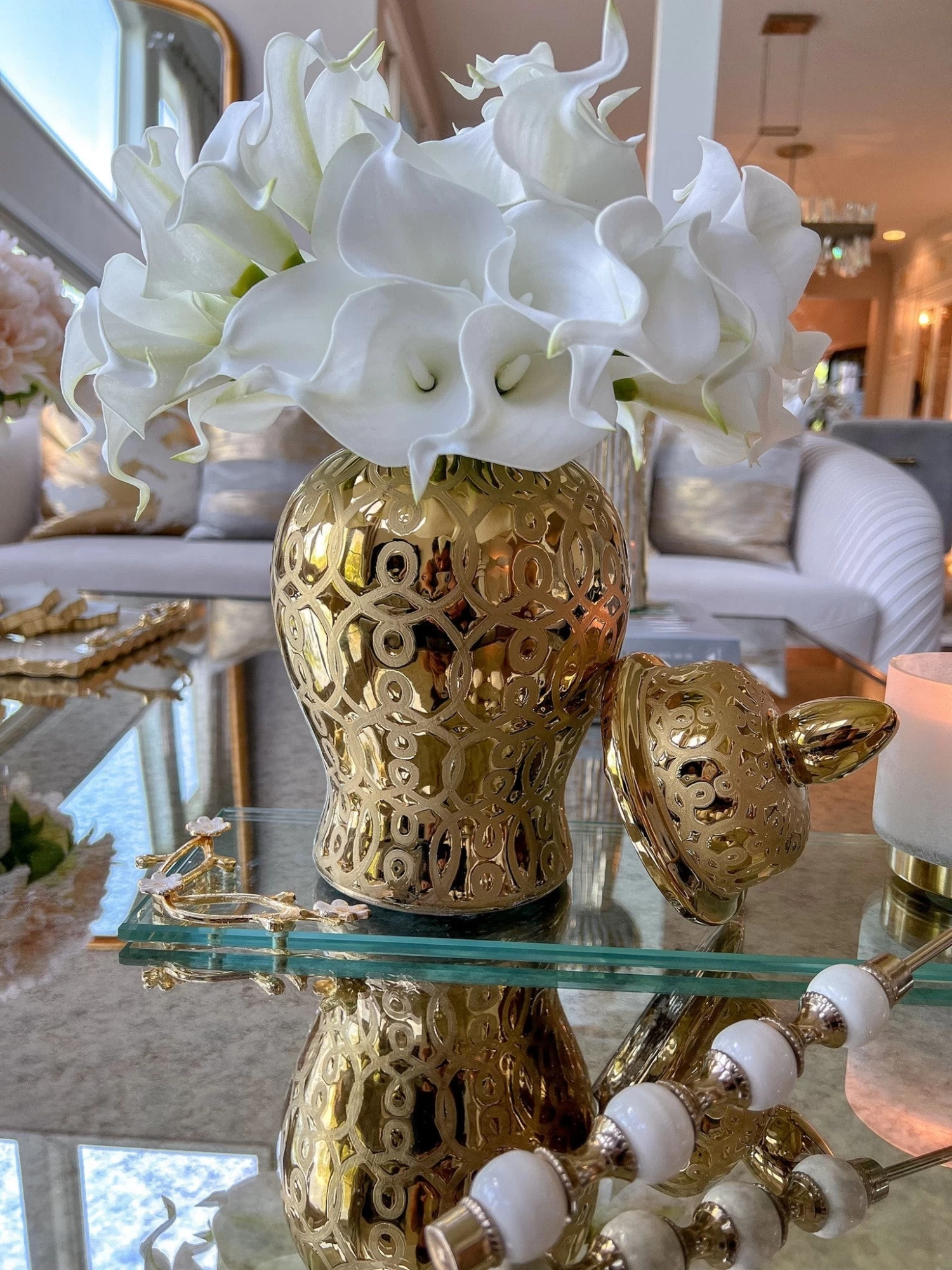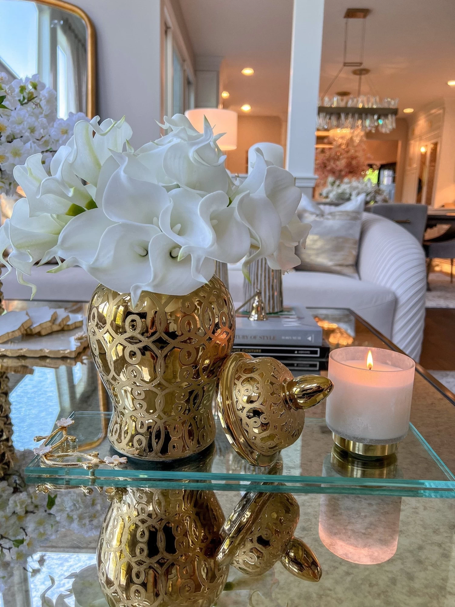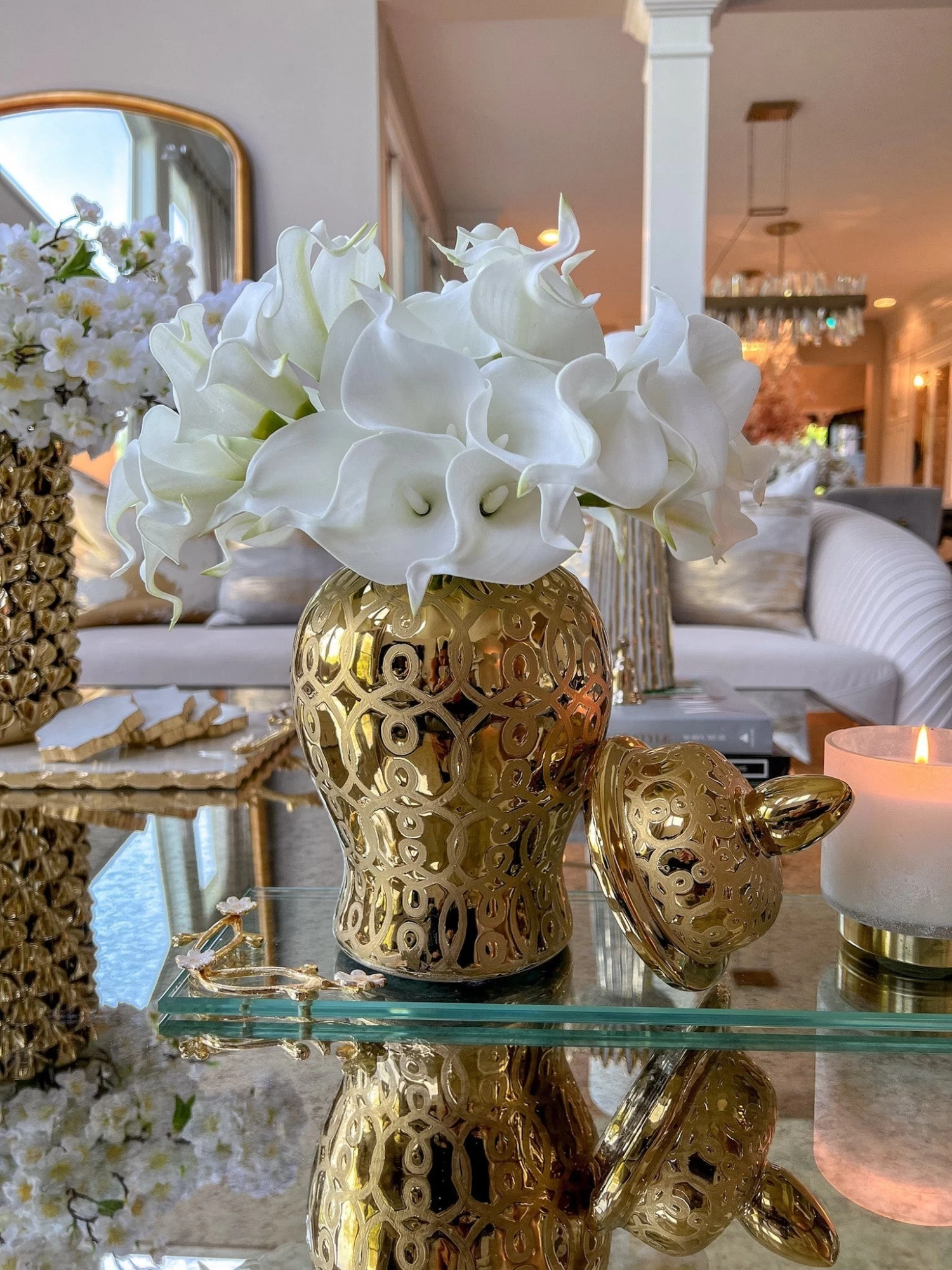 Description: This beautiful rectangular glass tray has stunning gold details with a cherry blossom design!