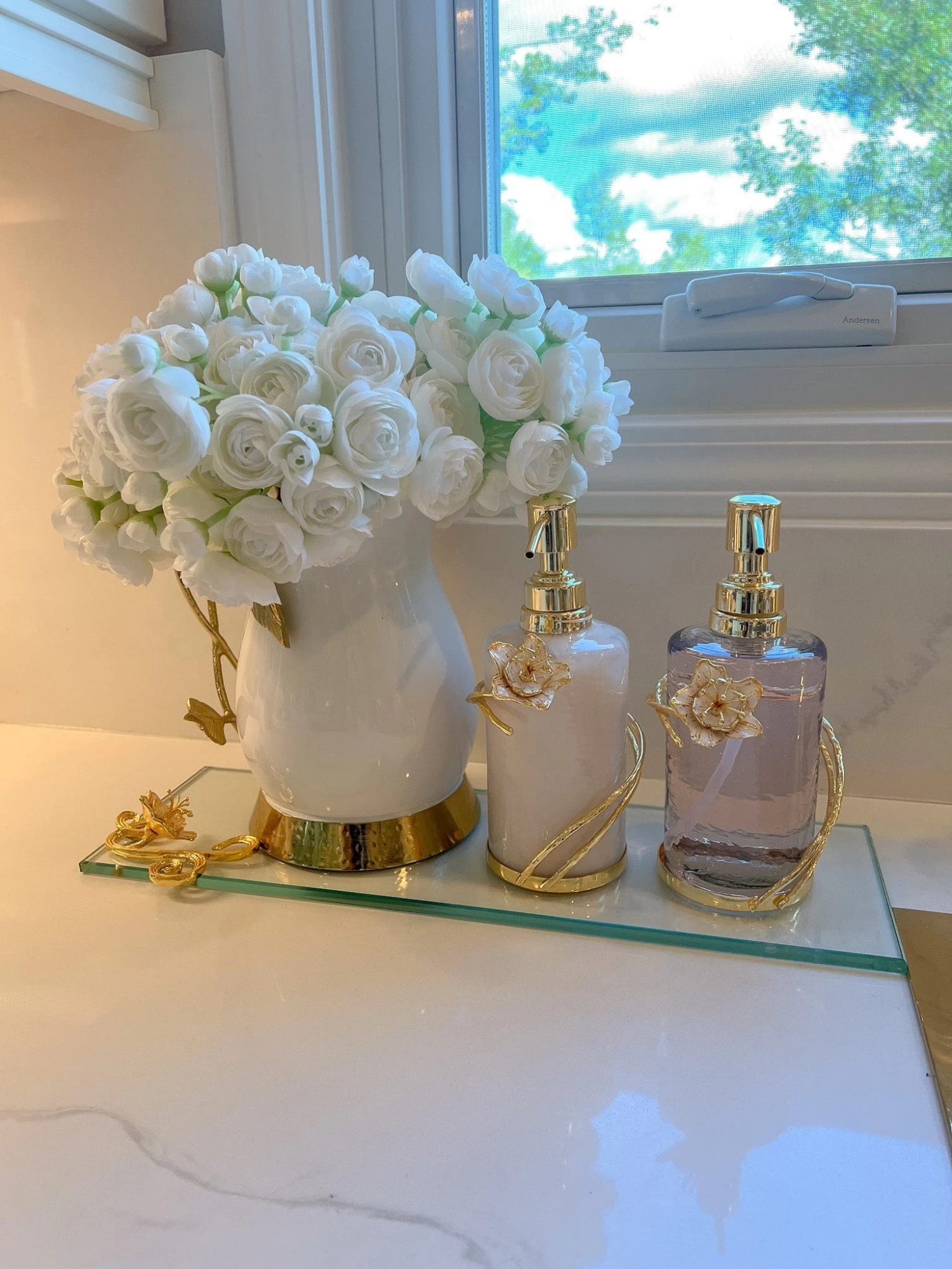 Description: This beautiful rectangular glass tray has stunning gold details with gold and white flower design! Use this for layering under our glass soap pumps or this would make a beautiful candle tray as well.