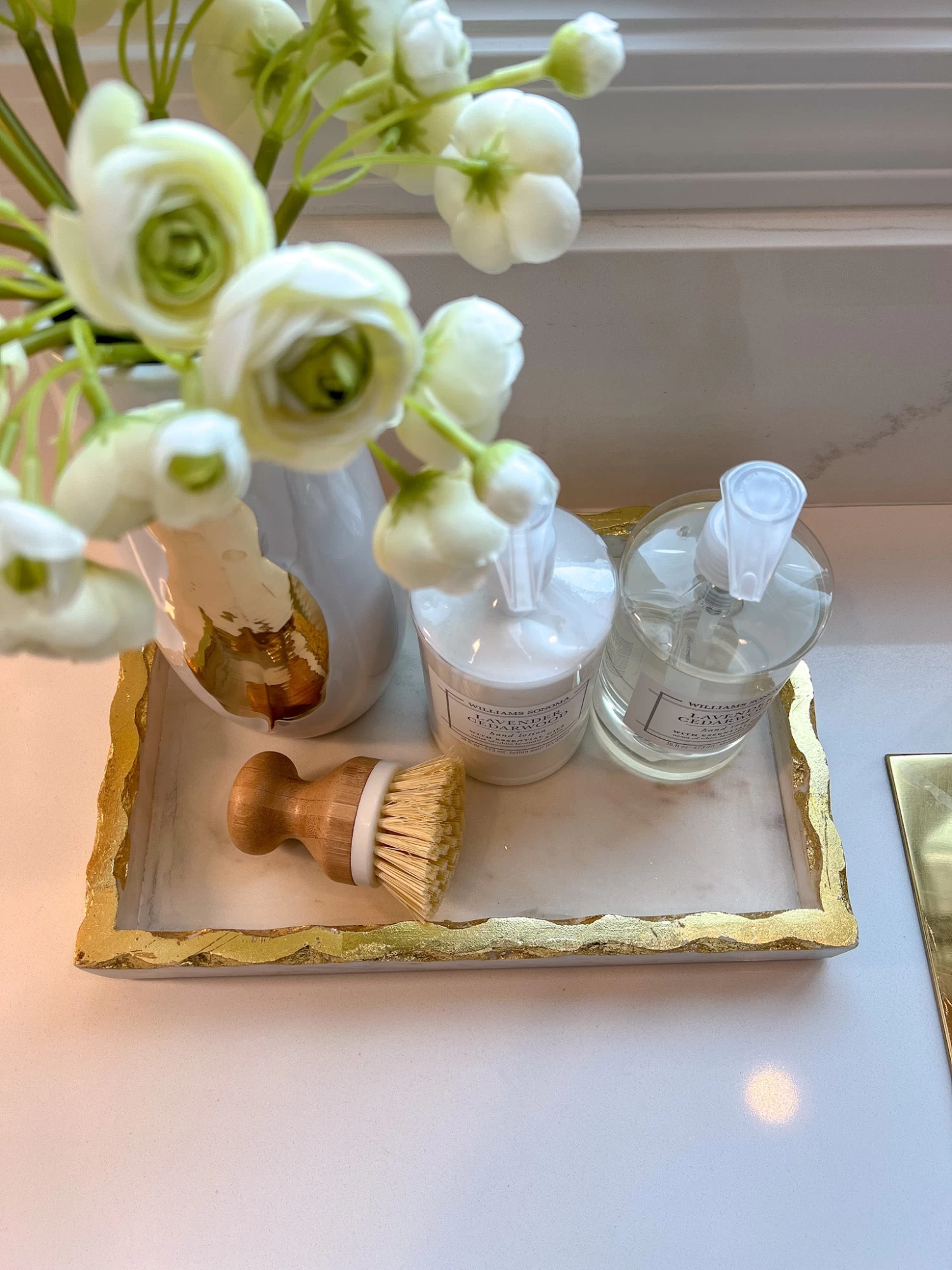 Description: This marble tray with gold trim has so many uses. It is a versatile piece that can be used in numerous ways. You can place it in your living room or bedroom to display your favorite items such as candles, books, or picture frames. The tray can also be used in your kitchen or bathroom to hold your lotions, soaps, and scrubbers, making it easy to keep your sink area tidy and organized. Its elegant and sophisticated design makes it a perfect addition to any home decor.Â