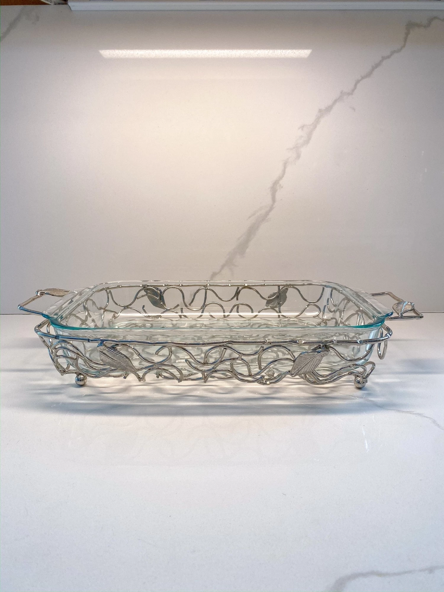 Description: We brought this piece back in silver finish because of popular demand! We love the intricate detailing the metal base gives and the functionality of the glass pyrex. Why sacrifice style for functionality?