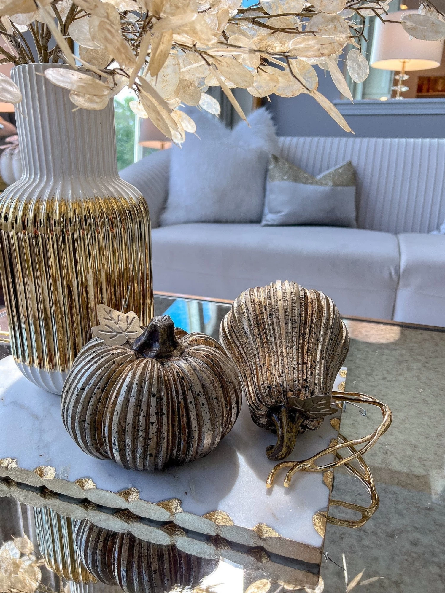 Description: This stunning bronze and gold striped fall decor have an intricately detailed little leaf that is perfect for fall and Halloween and is sure to elevate your decor!