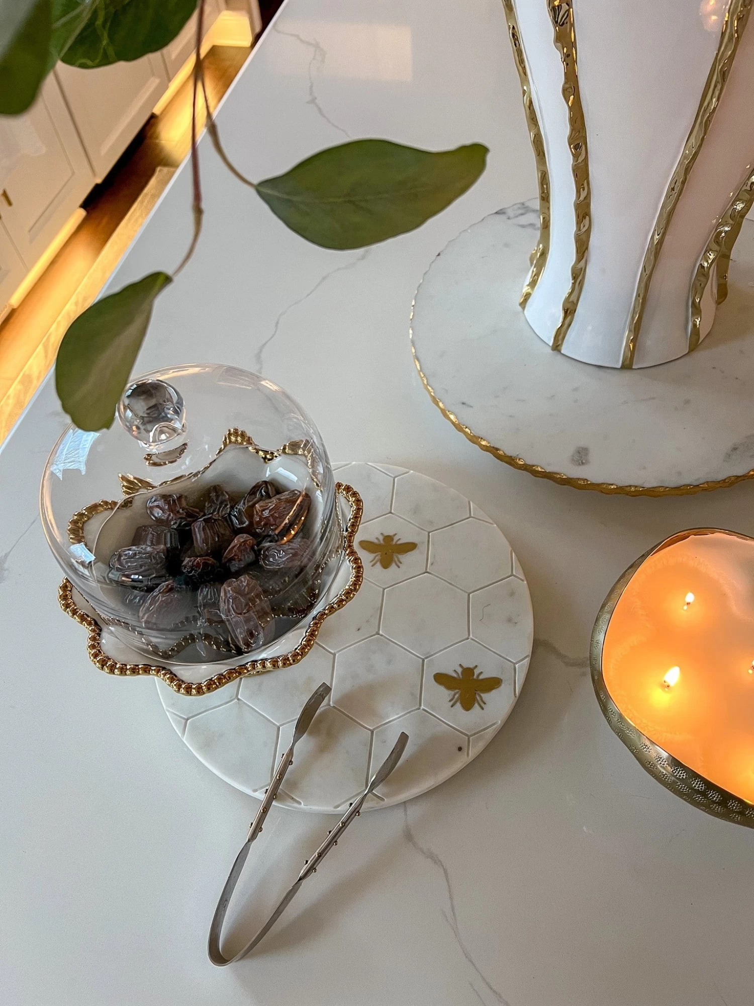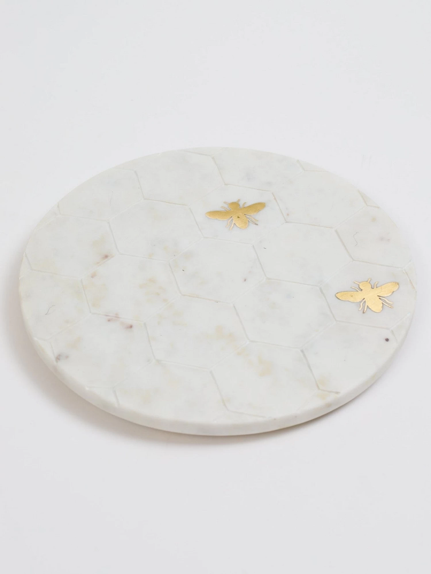 Description: This round marble platter features gold bee inlays and a hexagon pattern! We love the little details that make it so interesting!
