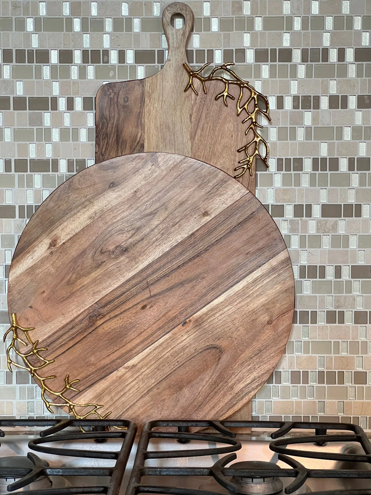 Description: This beautiful Charcuterie Board with its gold textured design will add a unique elegance to your serving display! Stand it up and layer it with other boards!