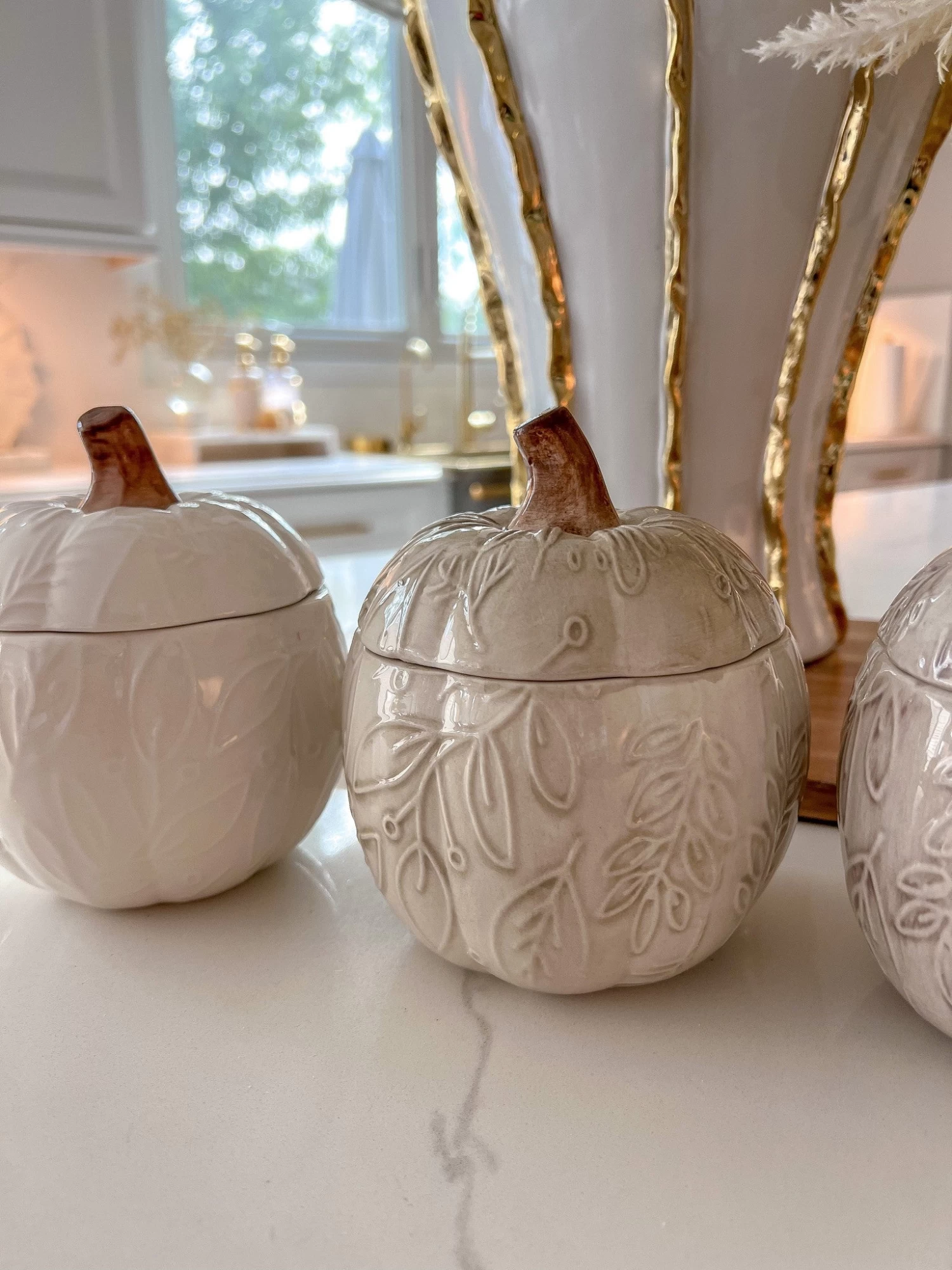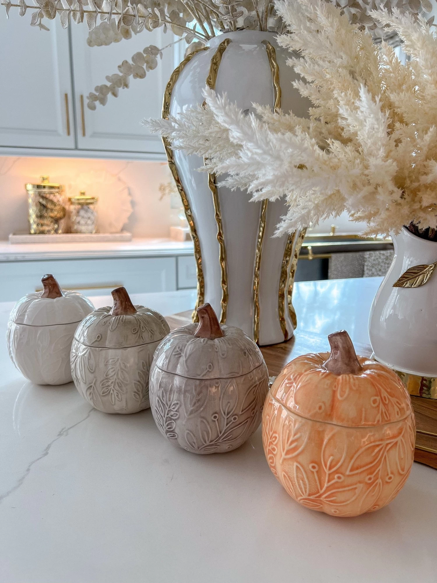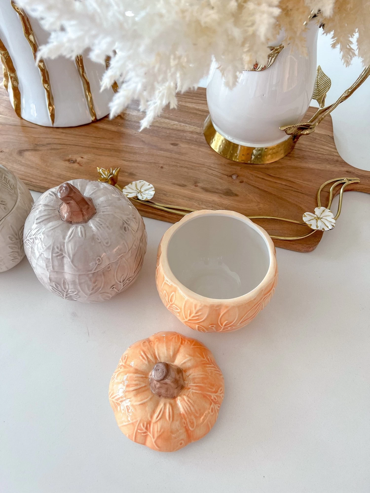 Description: This is the perfect size container for your favorite treat or small faux florals. This ceramic pumpkin is very detailed and comes in four different colors. Each is priced separately.