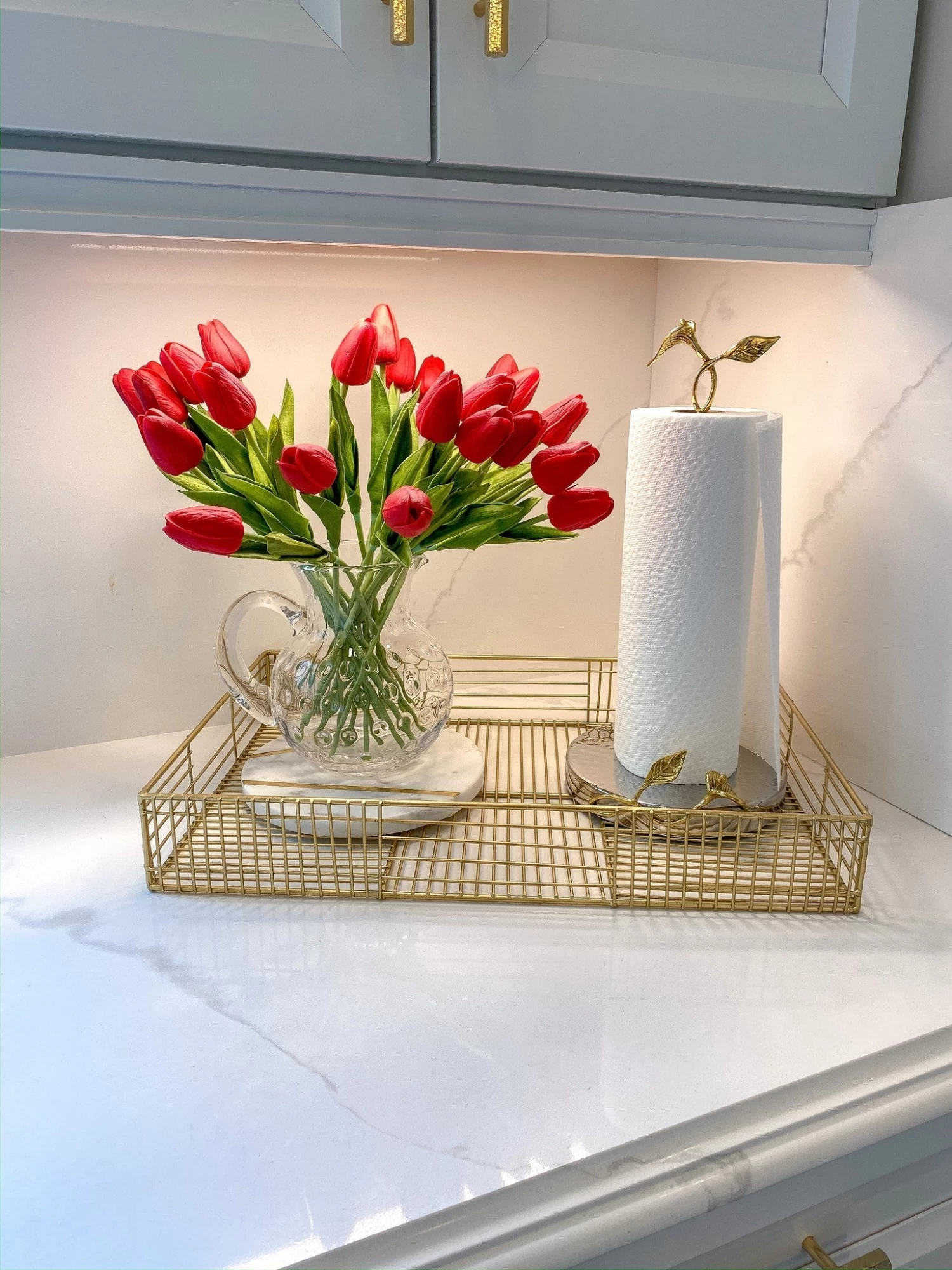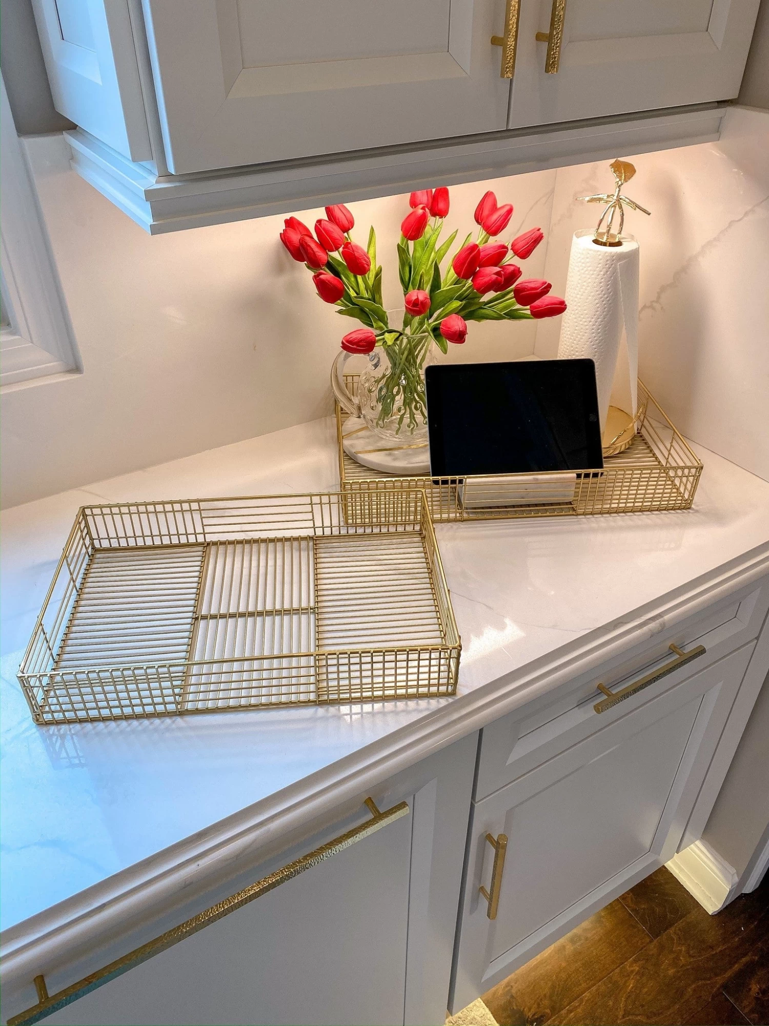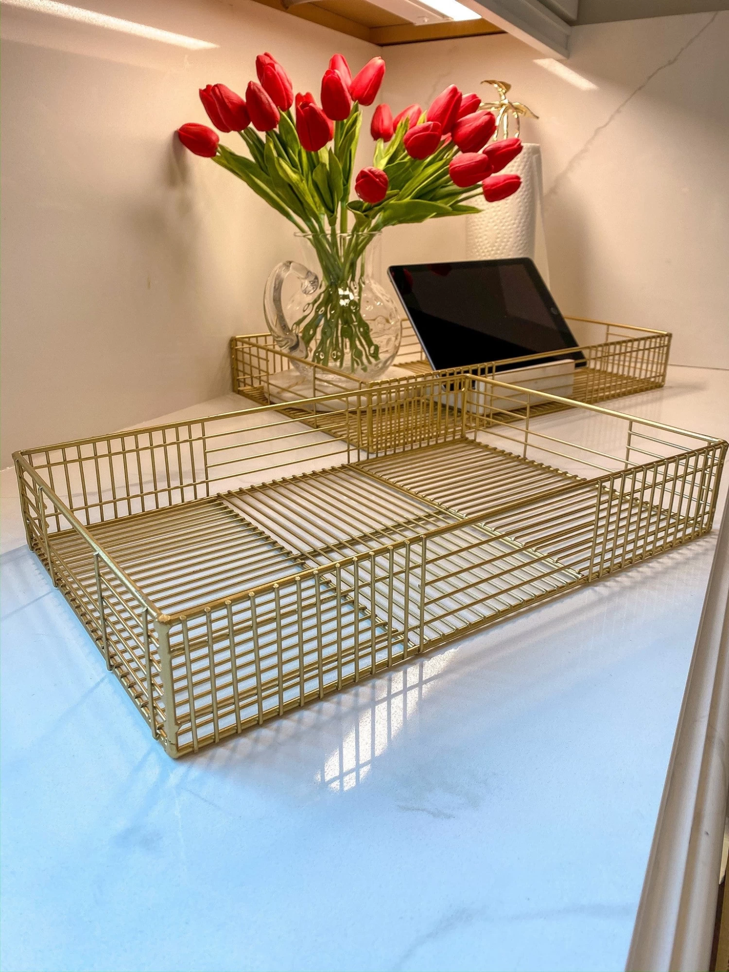 Description: This set of two metal basket trays are perfect for your linen closet, shelves, or restroom organization. We love that it has a glam look while still being functional!