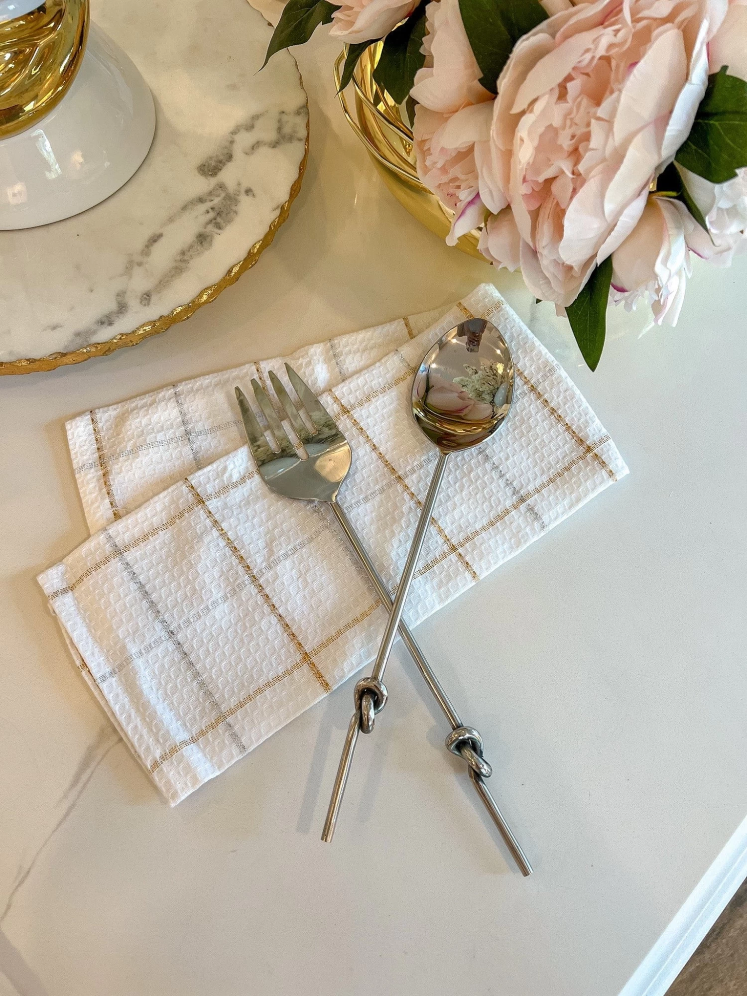 Description: This is a beautiful silver and gold serving set which has a knot detail and will tie in well with any decor.