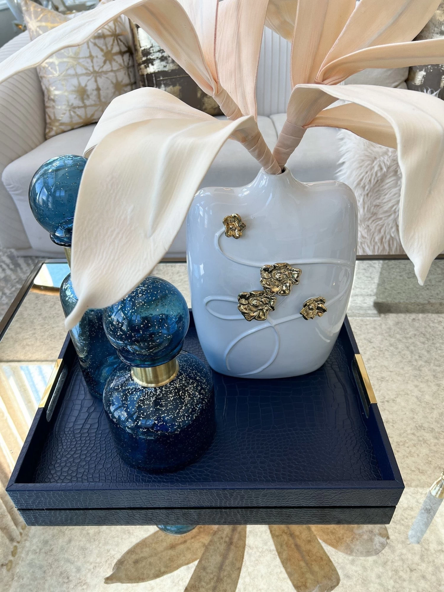 Description: This dazzling set of three detailed trays offer a unique and modern design style! We love the bold gold handles, complimented with the faux dark blue leather finish!