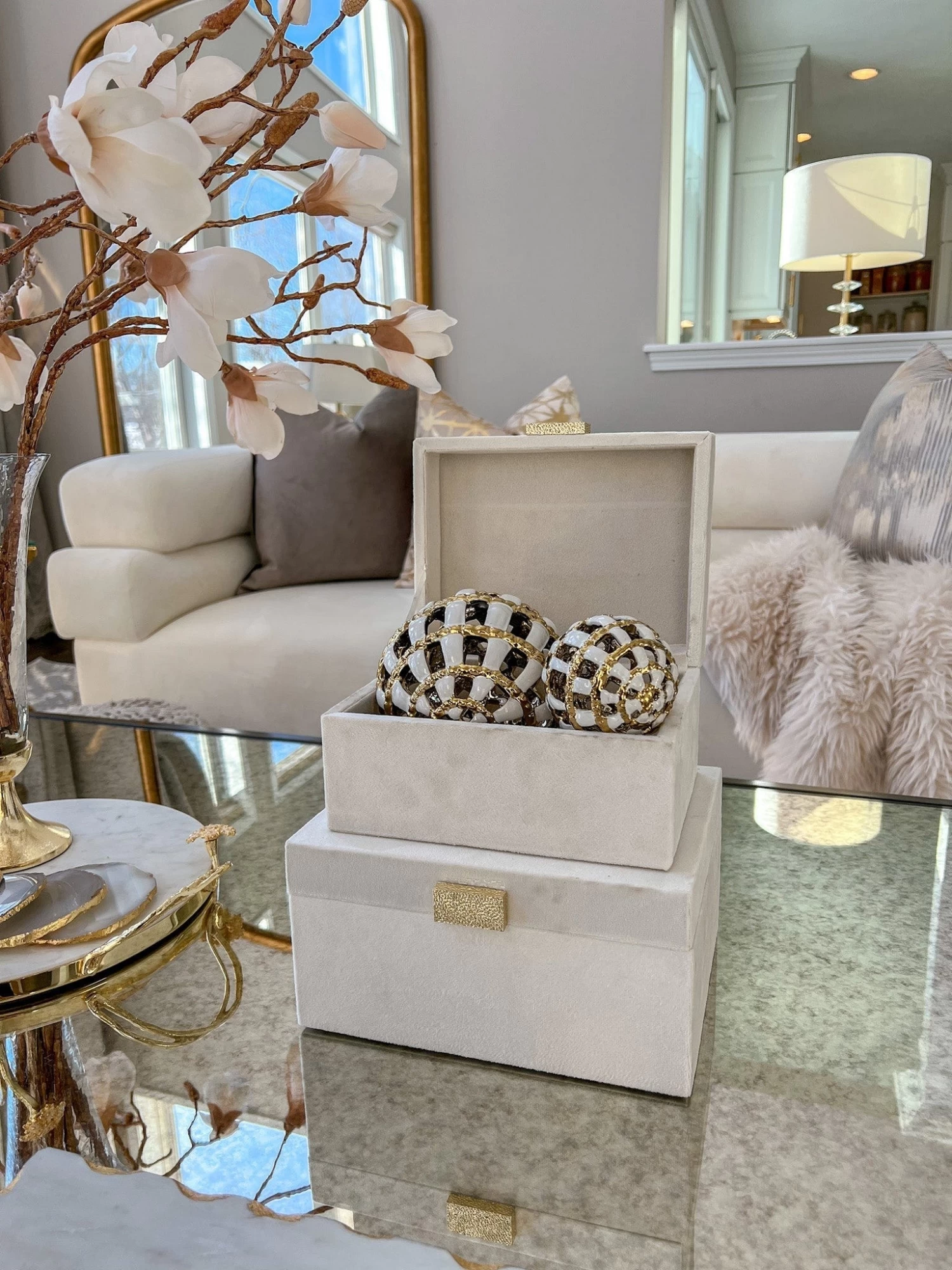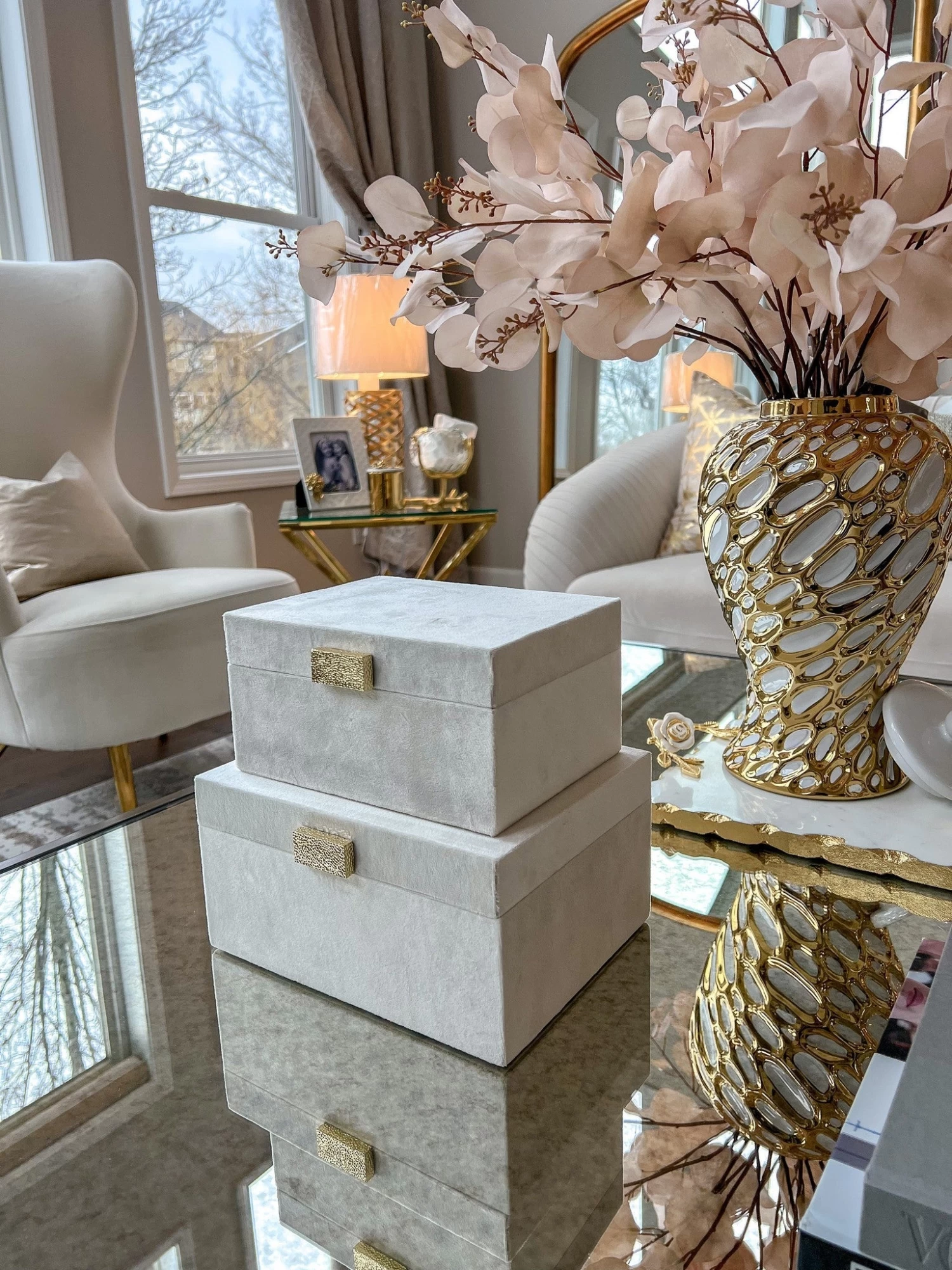 Description: These beautiful velvet boxes are simply stunning! Just in time to start the New Year! Keep this box set on your coffee table and store your remote, or style in your bedroom and tuck away your jewelry!