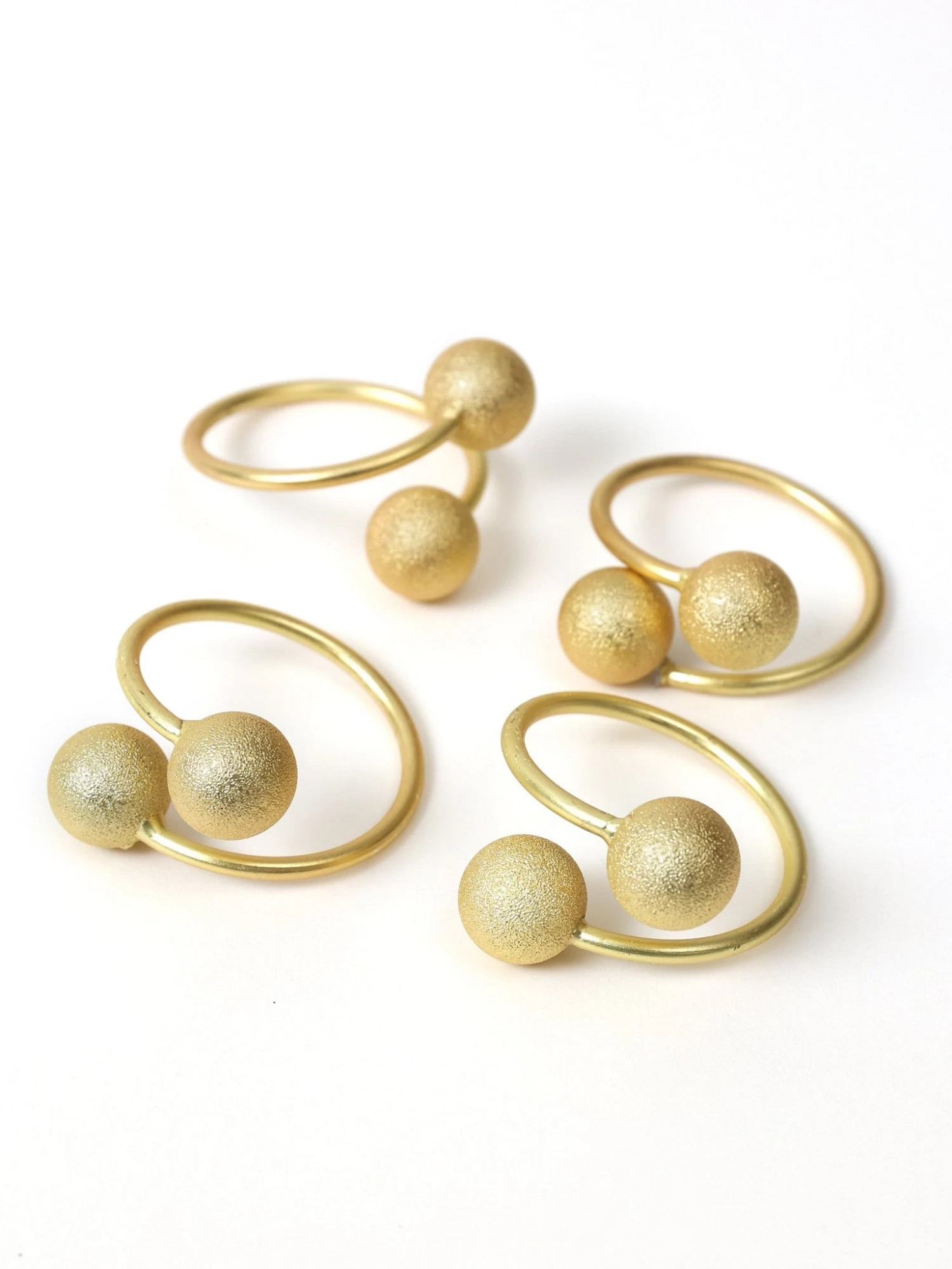 Description:Â This set of 4 matte gold double ball napkin rings is perfect for completing any stylish table setting. Ideal for family gatherings and dinner parties, the rings are sure to delight. Elegant yet durable, this set provides an elevated look to any occasion.