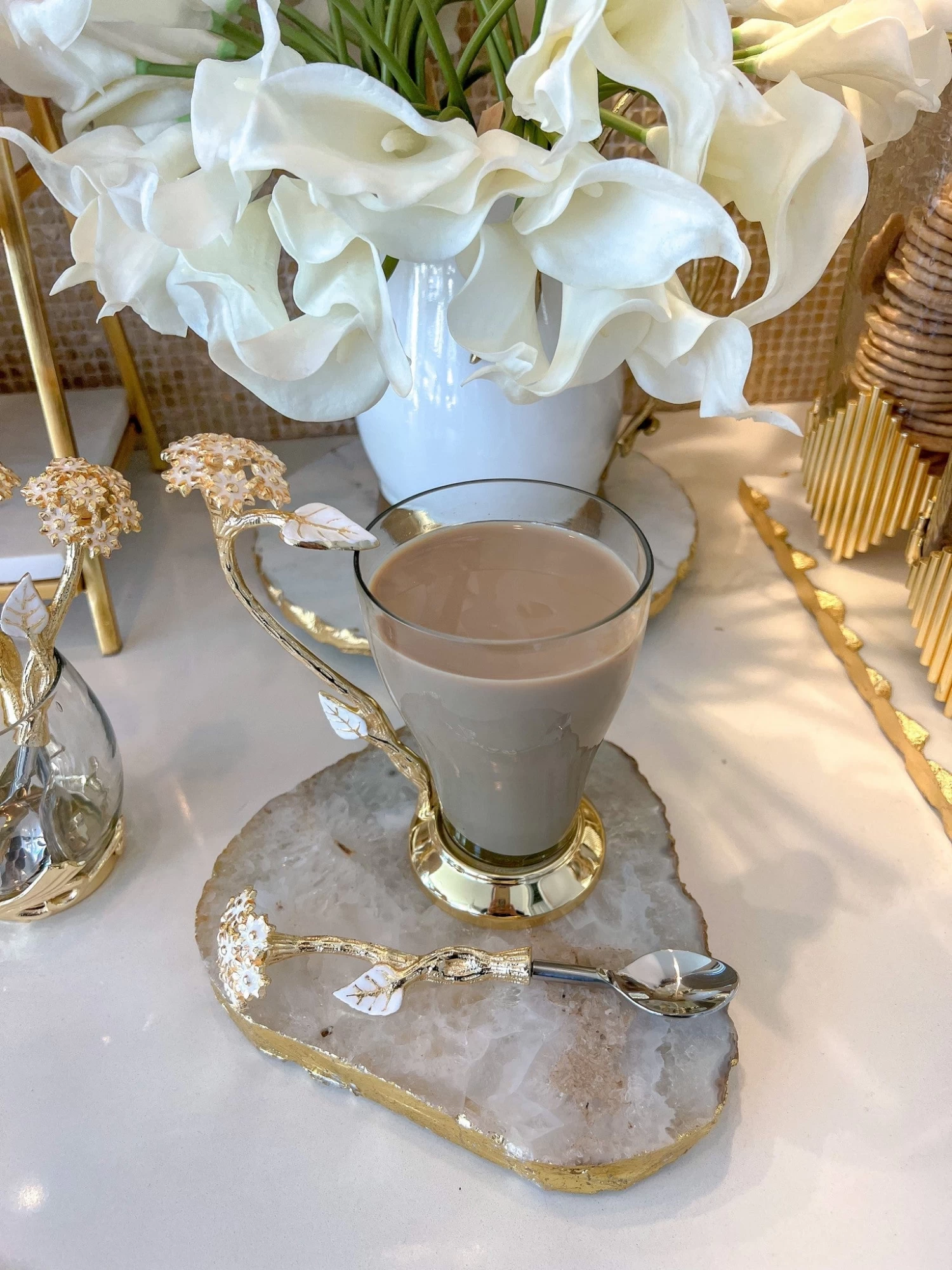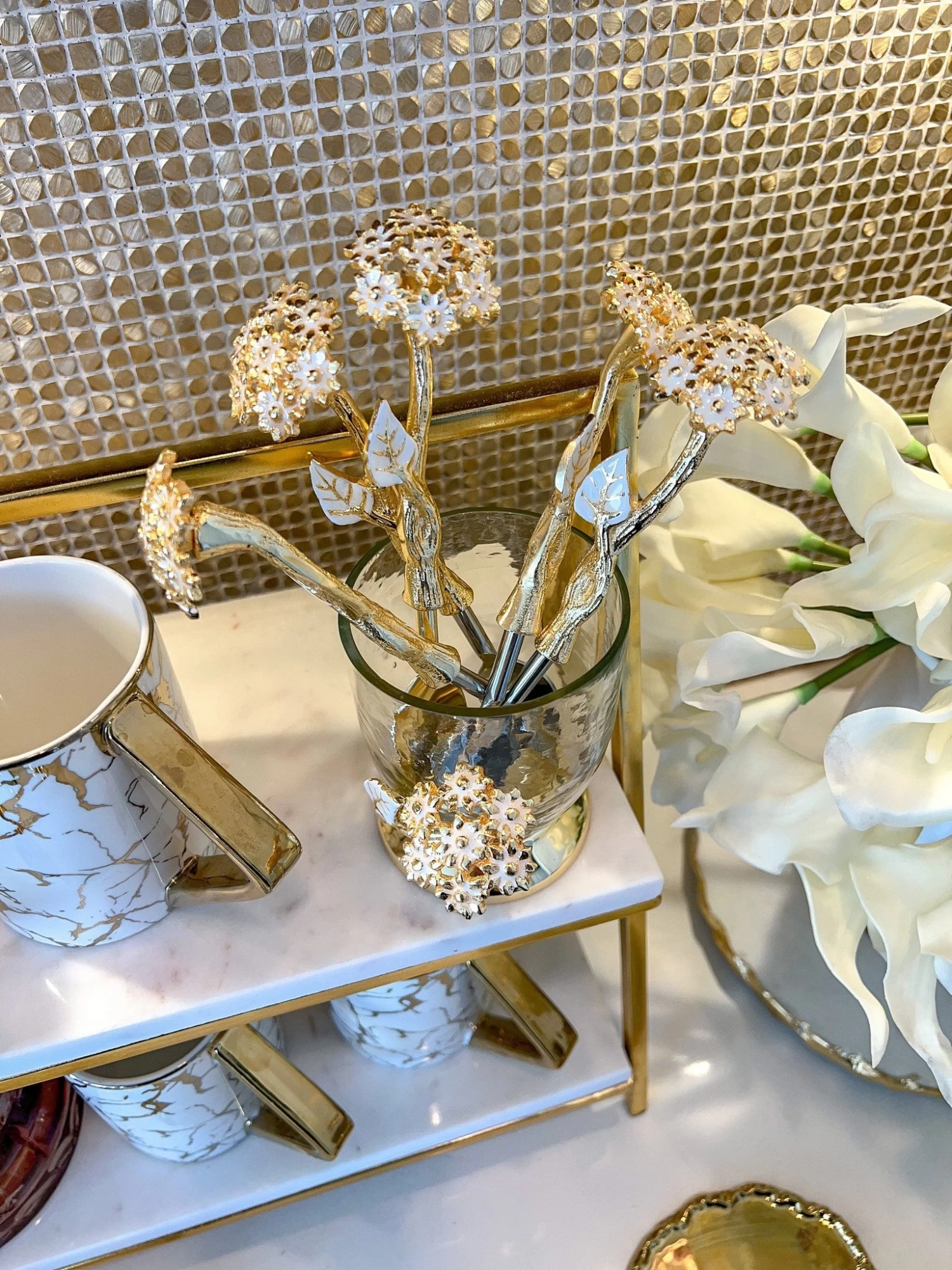 Description: Bring some timeless sweetness to your coffee station with our Set of 4 Silver and Gold Dessert Spoons from the Hydrangea Collection. These stunning spoons are essential for your classic coffee station – making it shine with a touch of gold!