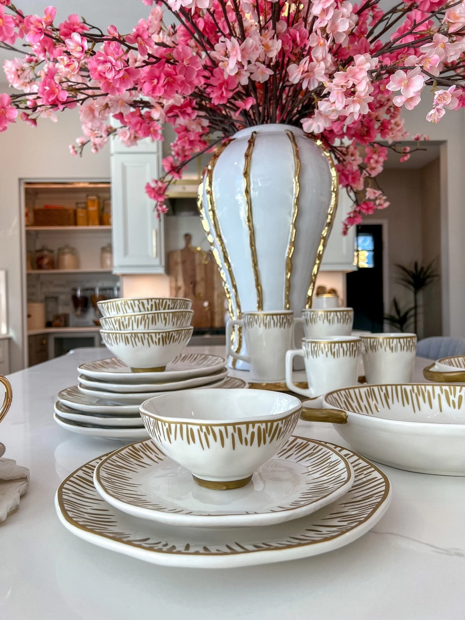 Description: This is an elegant set of four ceramic 5″ ceramic bowl. Showcasing a pattern of gold stripes applied to a creamy white finish. Pair these with the matching mugs and serveware for a future heirloom to be cherished for generations.