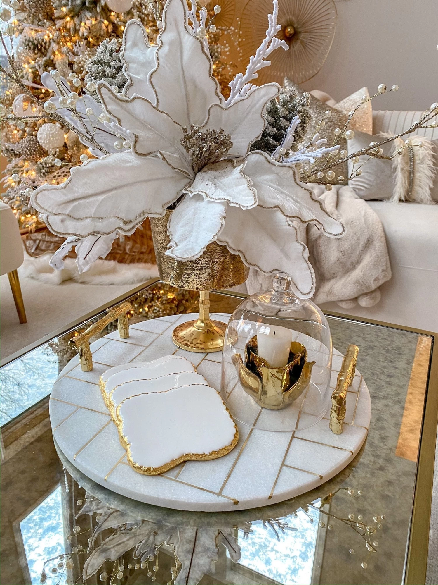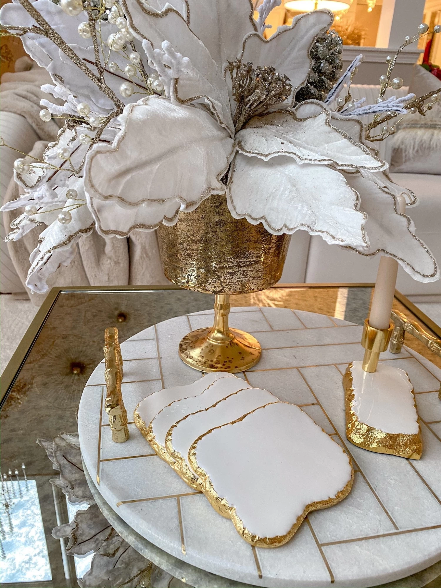 Description: Rest your drinks on these stylish coasters! The white top is balanced by the gold finish to create a small piece of luxury right on your coffee table.