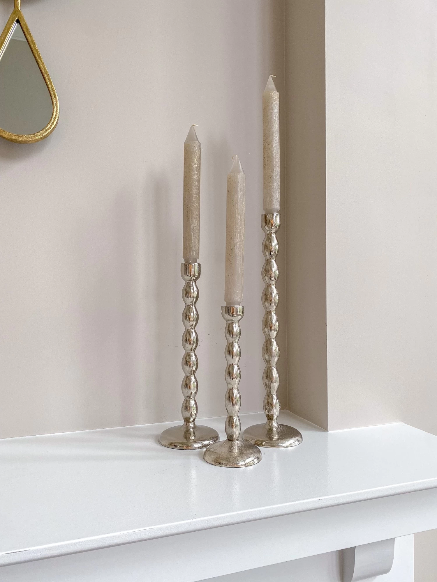Description: These elegant braided candle sticks are the perfect accessory for any season! The simple braided design will fit well in any home, and offer a beautiful base for your favorite taper candles. Available in 3 sizes, each sold seperately. PS…available in silver and gold!