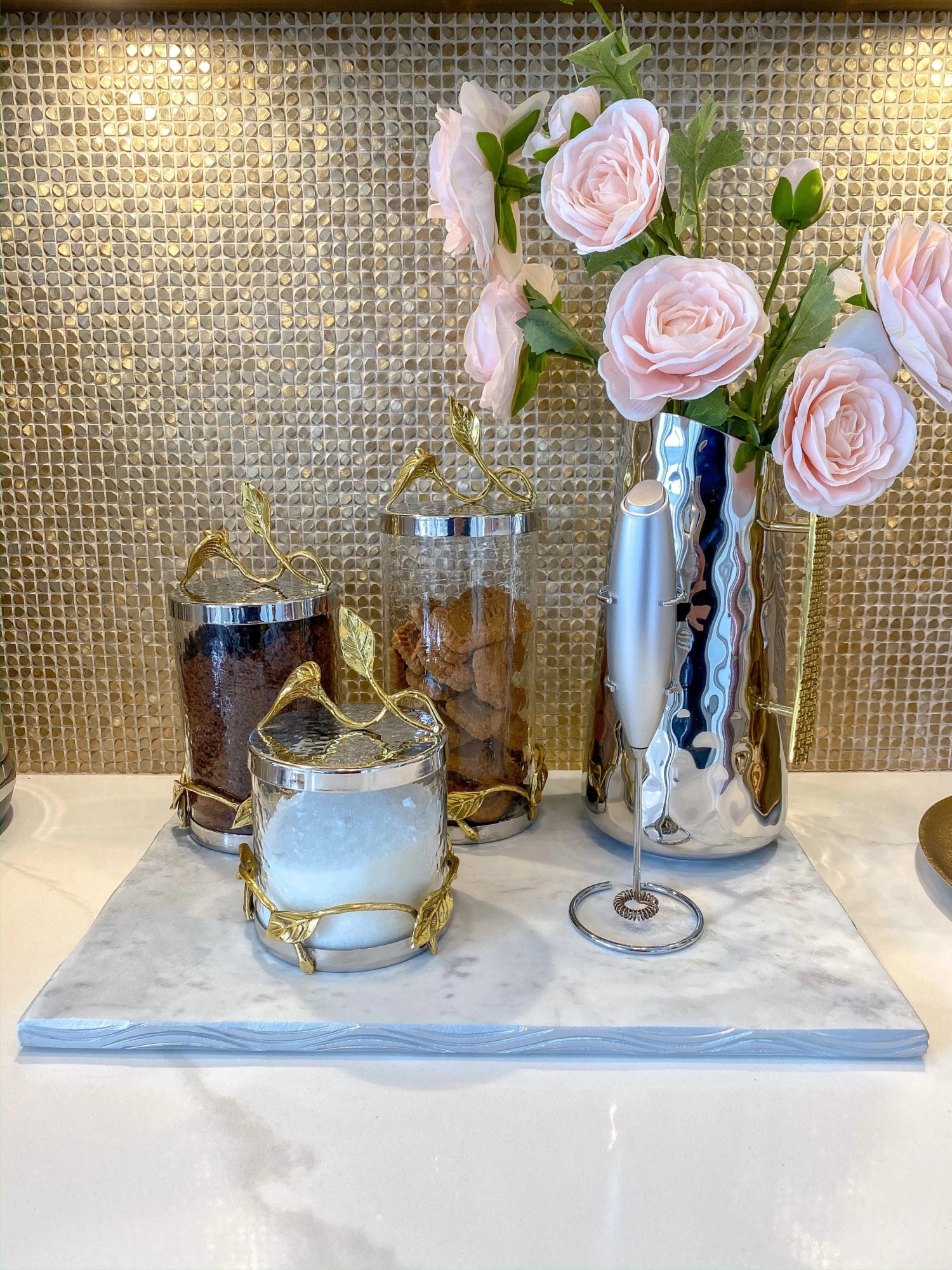 Description: This marble tray features a textured edge that matches back to a few of our other marble trays! We love the wave design on the edge and the glamour that it brings in! Style on your coffee table, kitchen island or anywhere else you can think of!