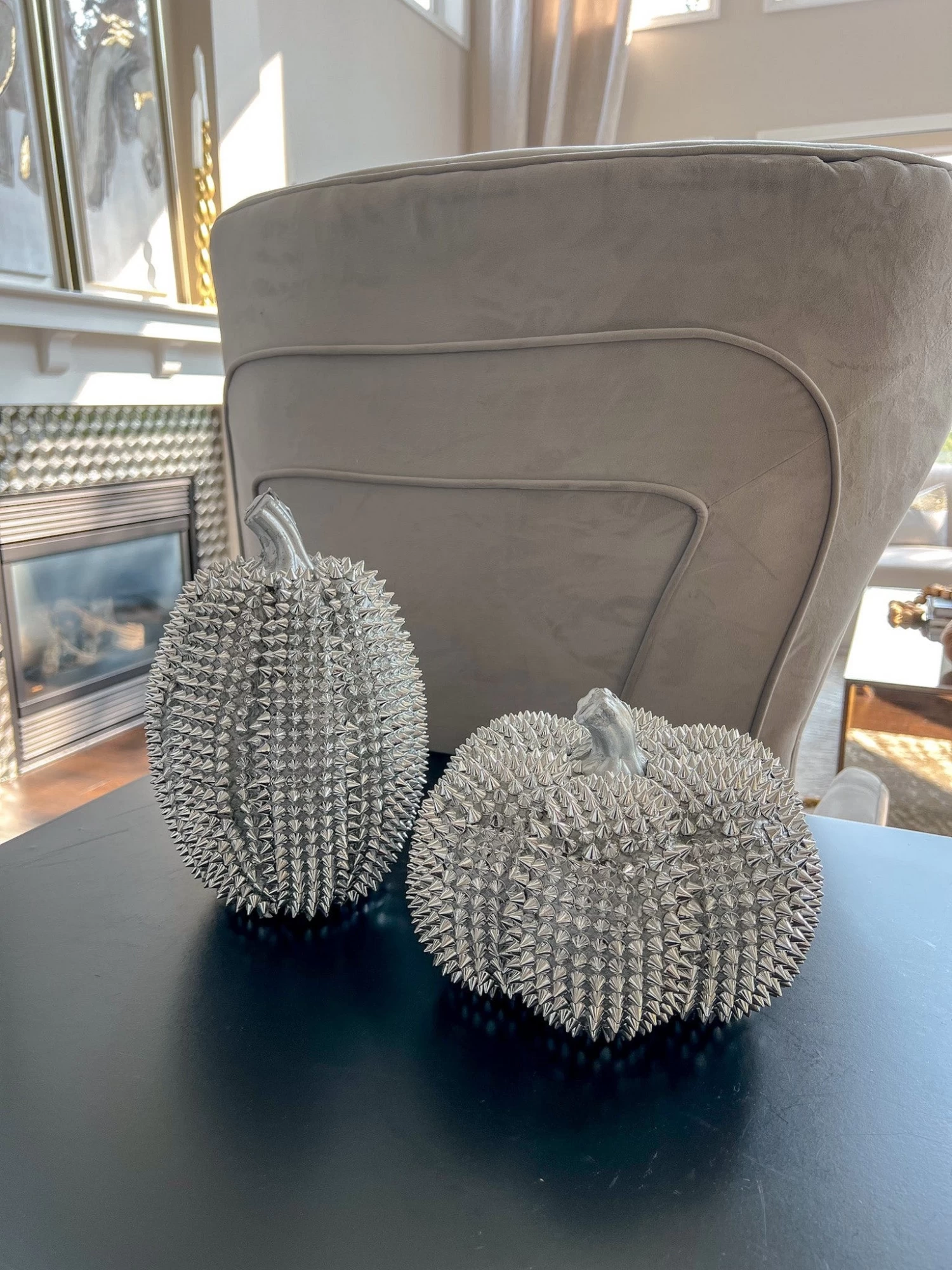 Description: These silver spiked pumpkins are so cool and unique! They are one of favorites and are sure to become one of yours. Use these to add some texture and a pop of silver to your fall and Halloween decor!