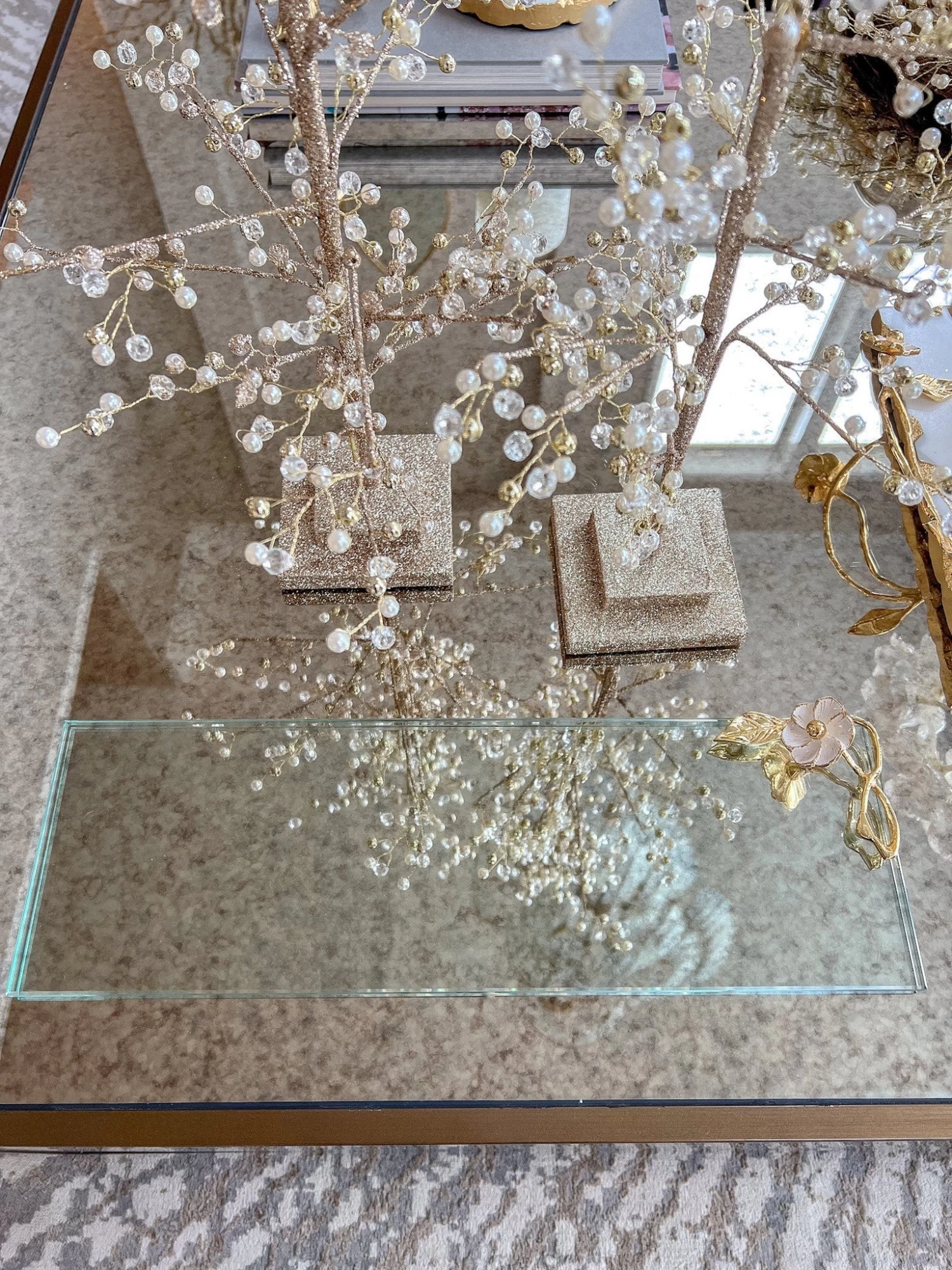 Description: This beautiful rectangular glass tray has stunning gold details with a white flower design from The Julia Collection! This tray works perfectly with the Canister set from the same collection or use this for layering to make the perfect candle vignette.