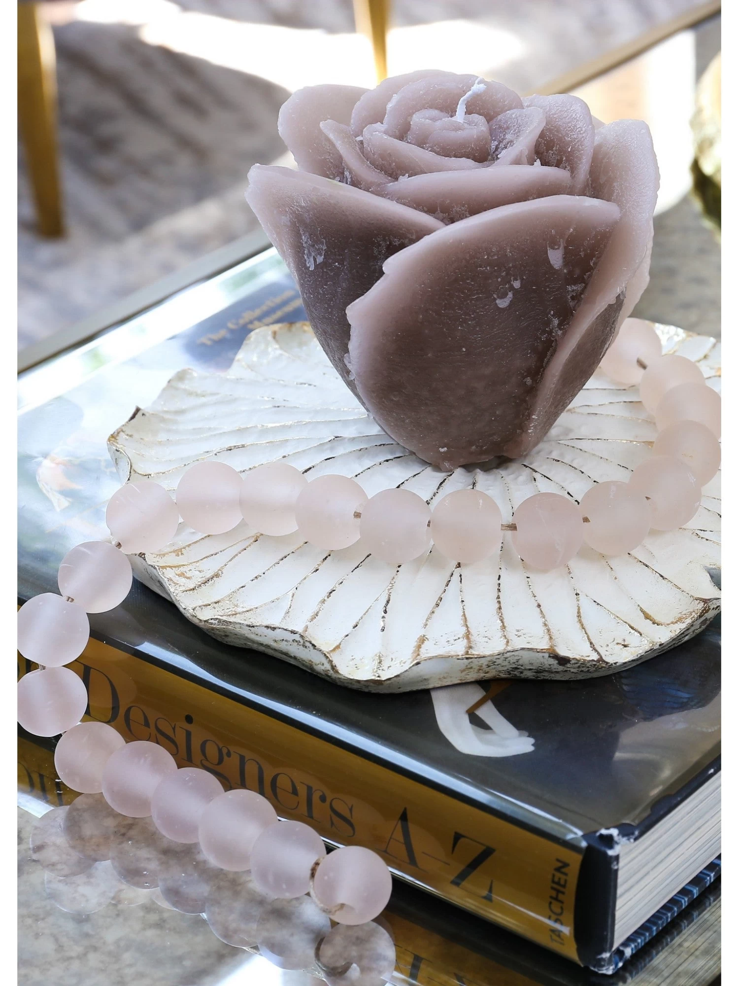 These lovely soft pink beads are constructed of glass and feature a matte finish. They are perfect to style on a tray with your favorite decorative coffee table books, or with a nice vase.