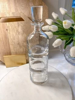 Description: This beautiful glass decanter is a truly unique piece! The decanter is stackable and comes with 2 additional cups! It makes for easy storage and a beautiful design!