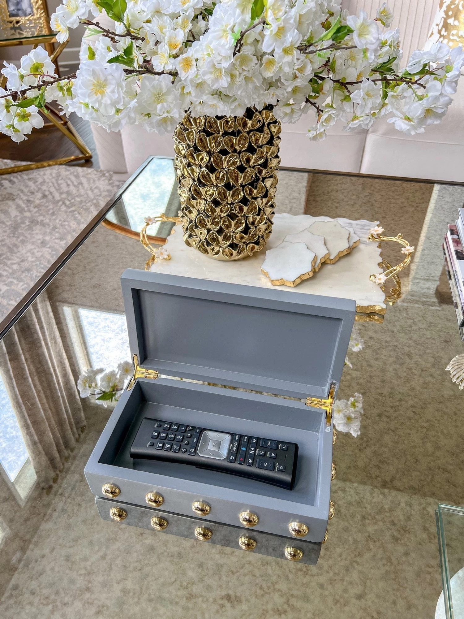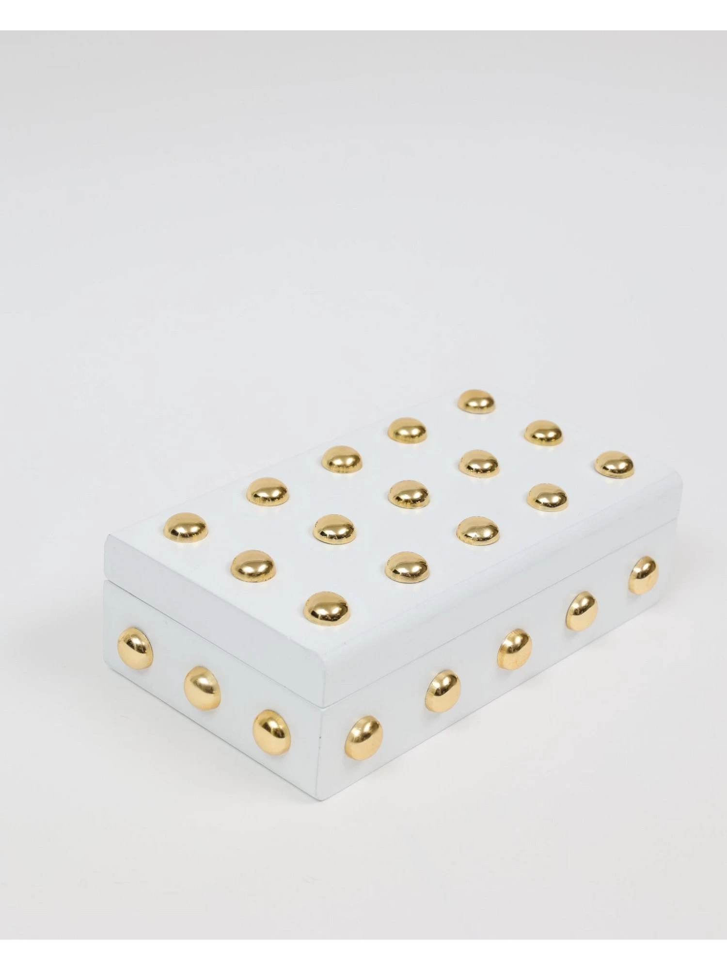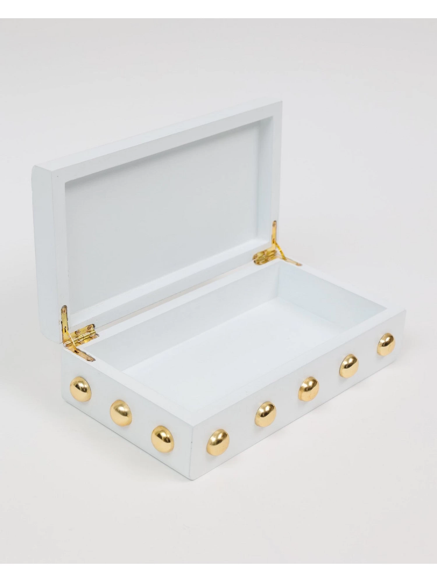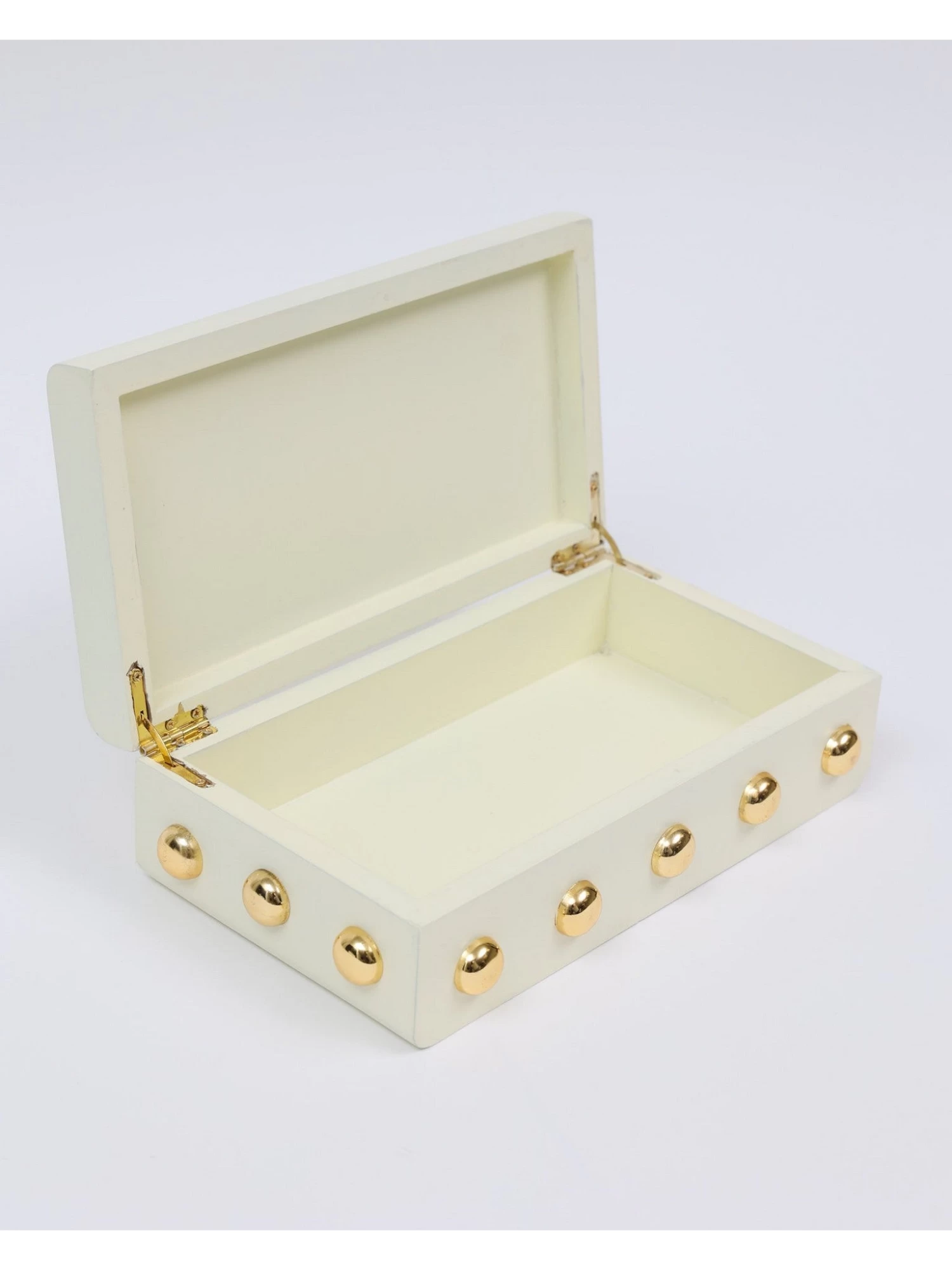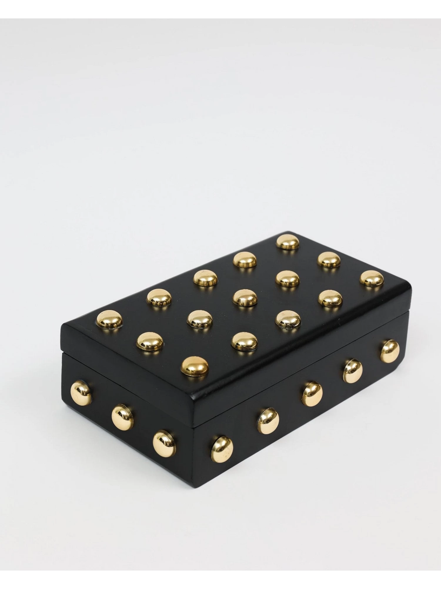 Description: This wooden box with its shiny gold studs is a statement maker.