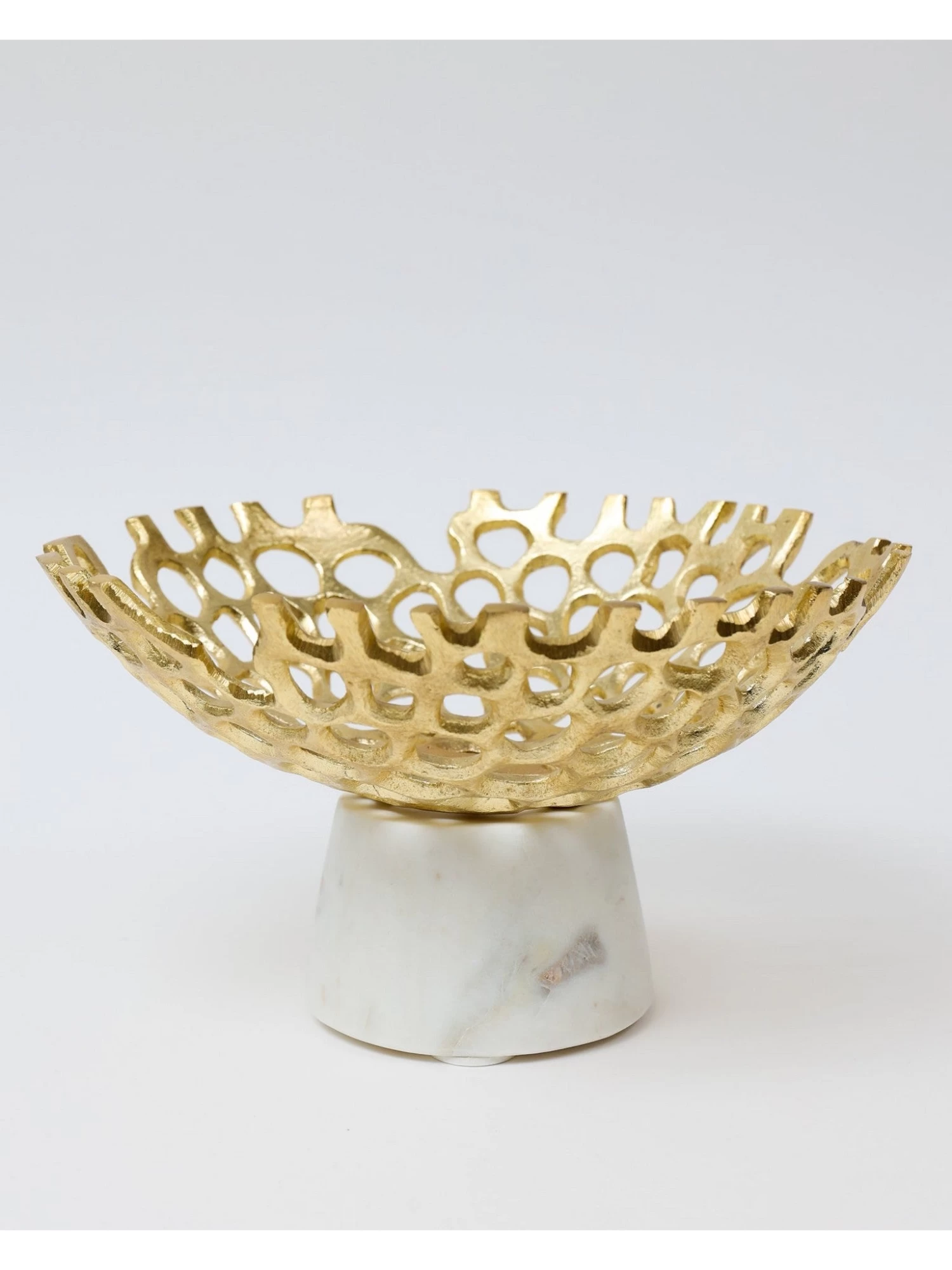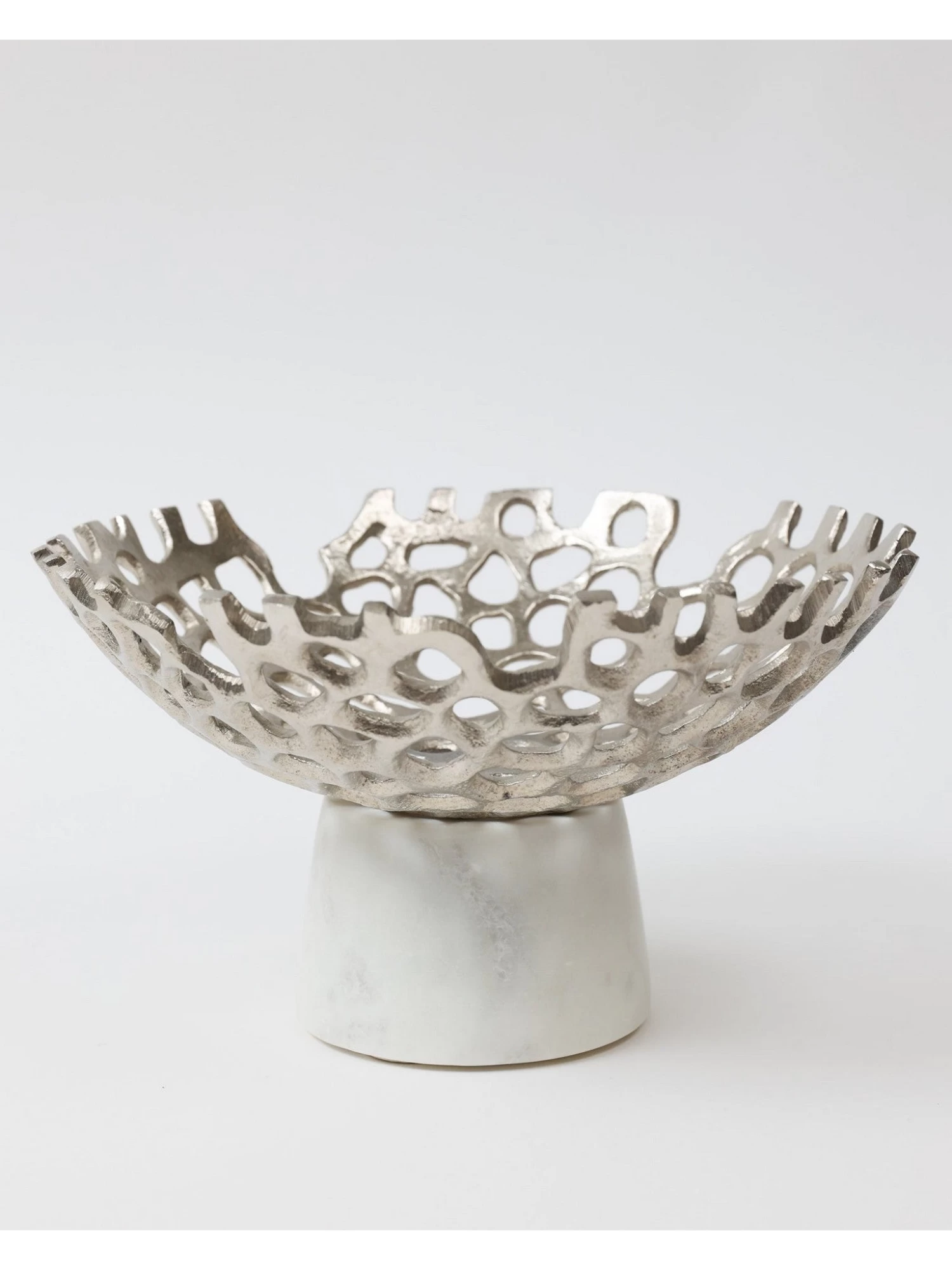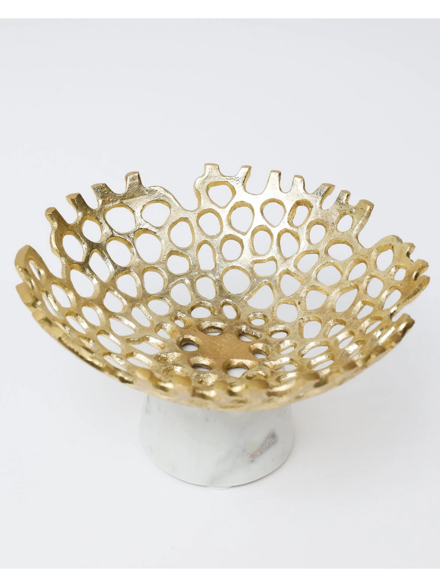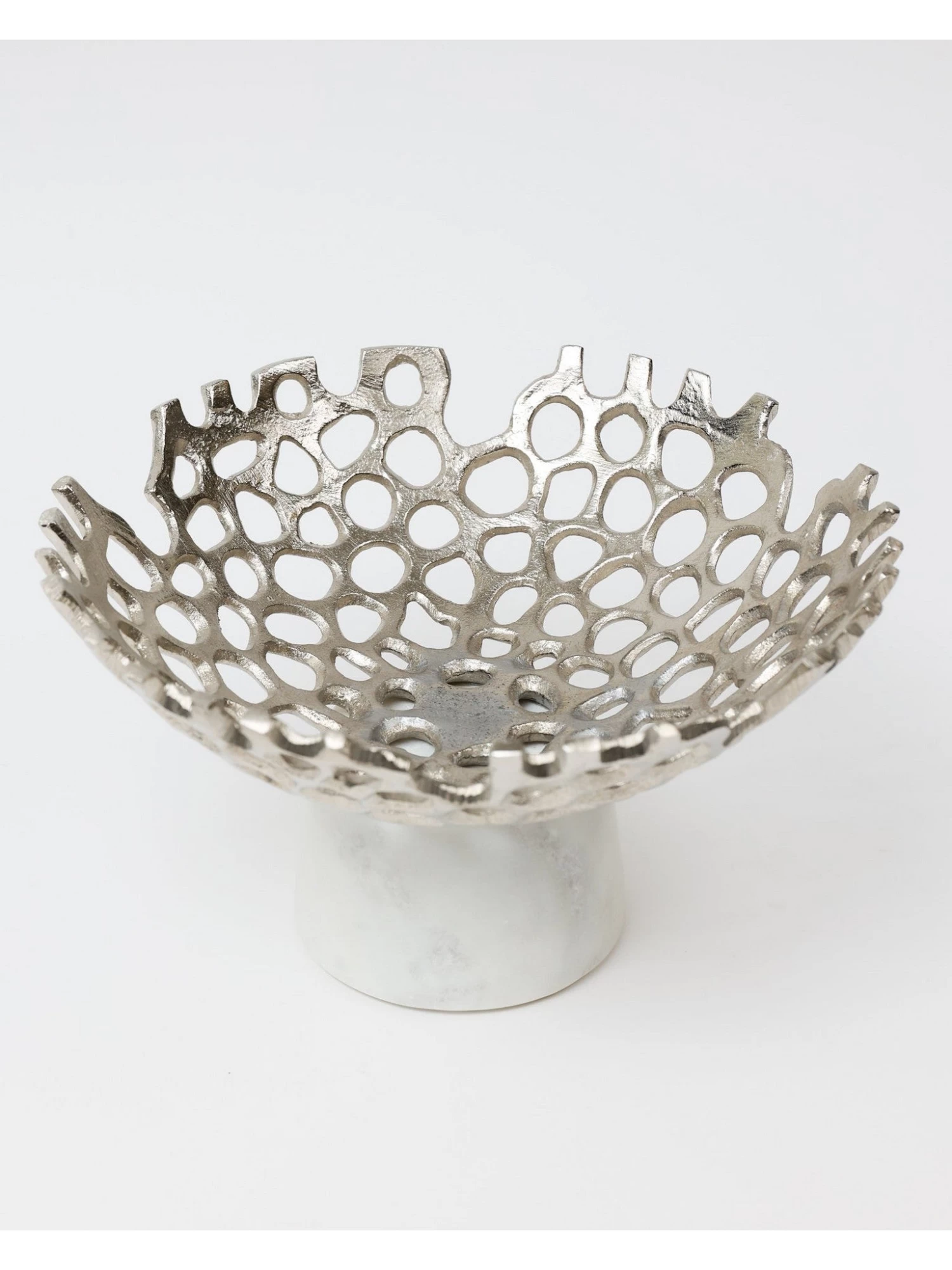 Description: This textured cut-out metal bowl is perfect for filling with your favorite fruits or floral orbs and will make a stunning display on its own.