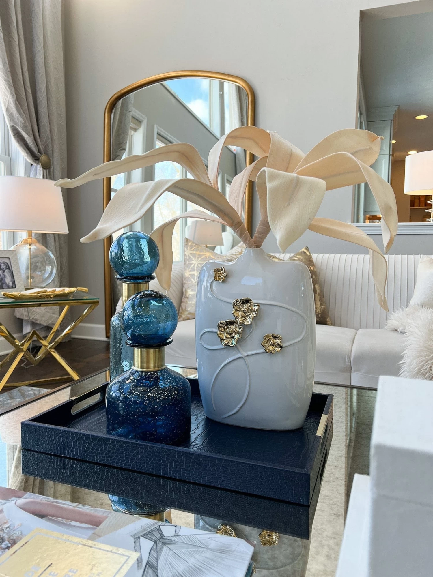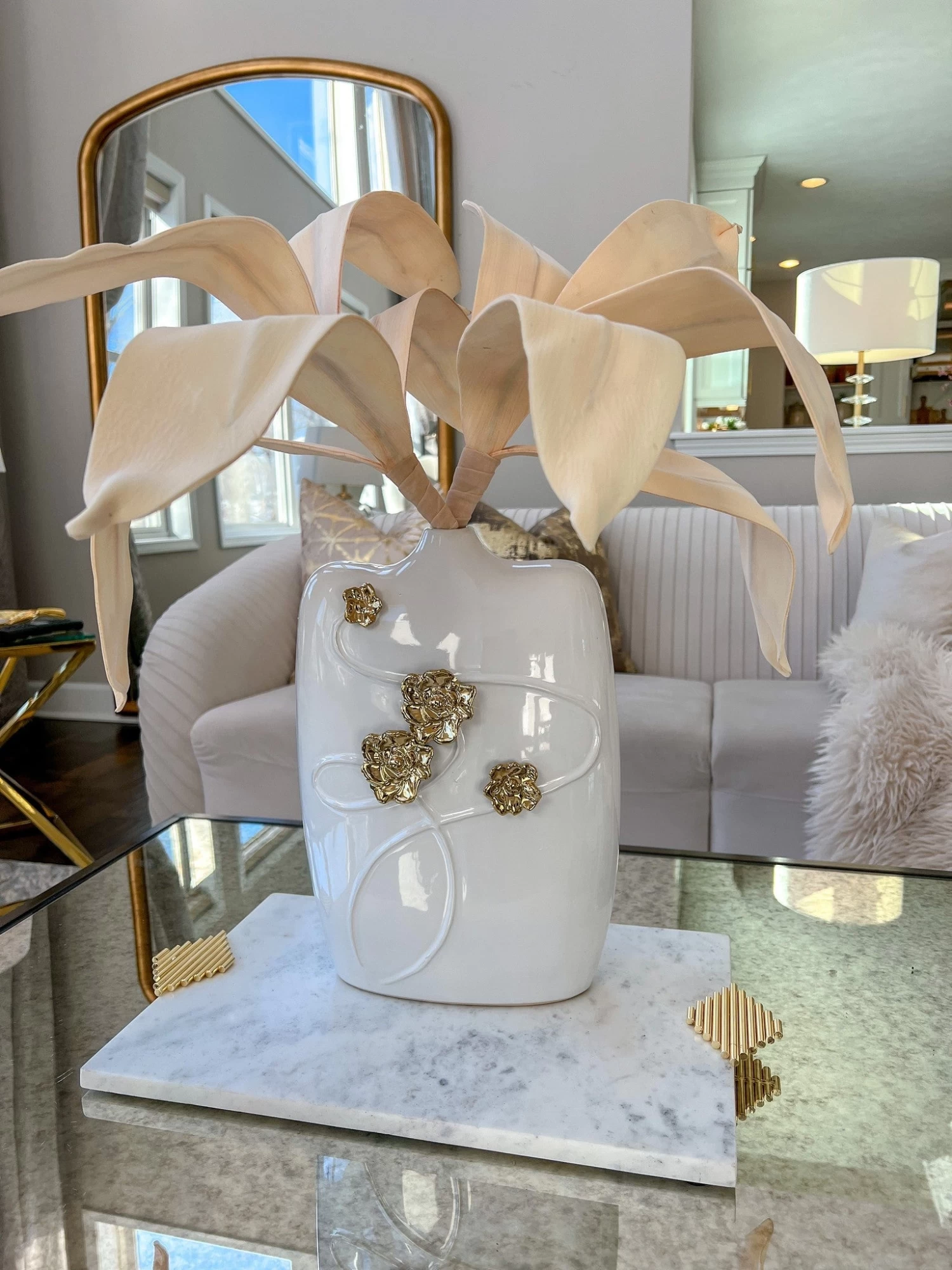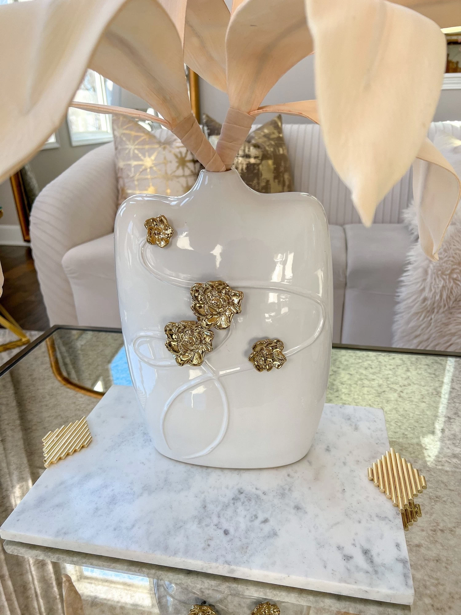 Description: This white and gold vase has such a beautiful and unique style! You can style it with your favorite faux florals and it is sure to make a statement!