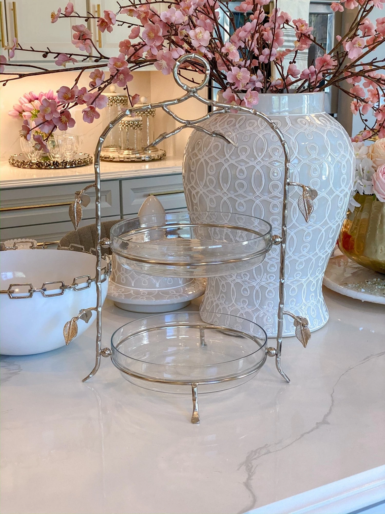 Description: This stunning two-tiered stand is a perfect base for your display! This features two glass bowls on a silver branch and leaf base, and if perfect for your serving your favorite treats or housing your home decor with style!