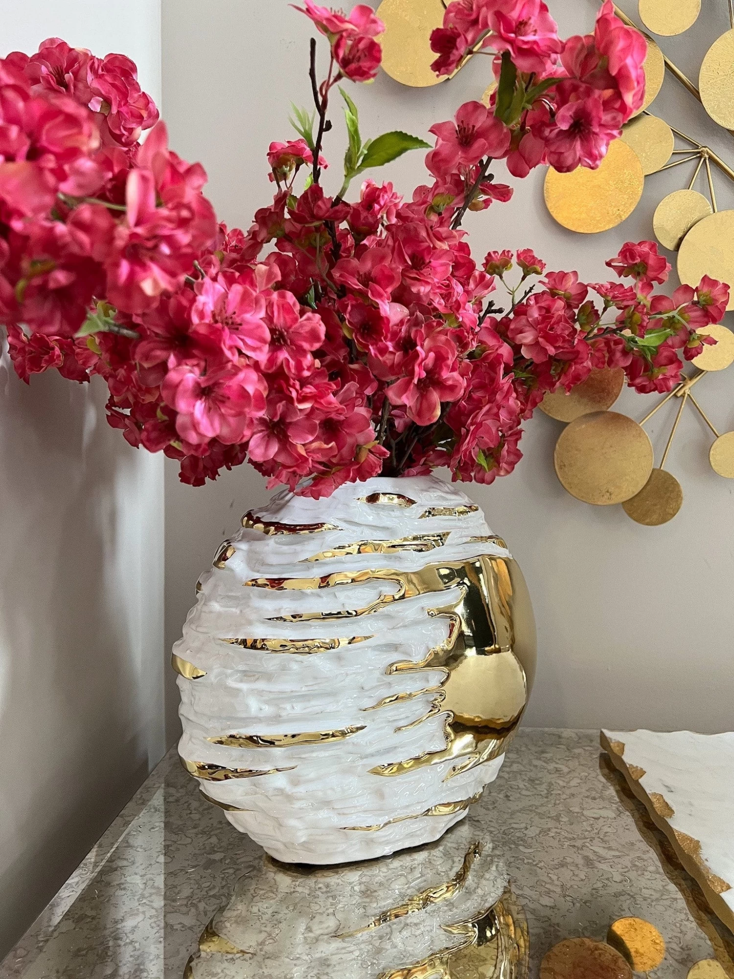 Description: This white and gold textured vase will bring some interest to any vingette! It ties back beautifully to our white and gold textured bowl if you want a matching pair!