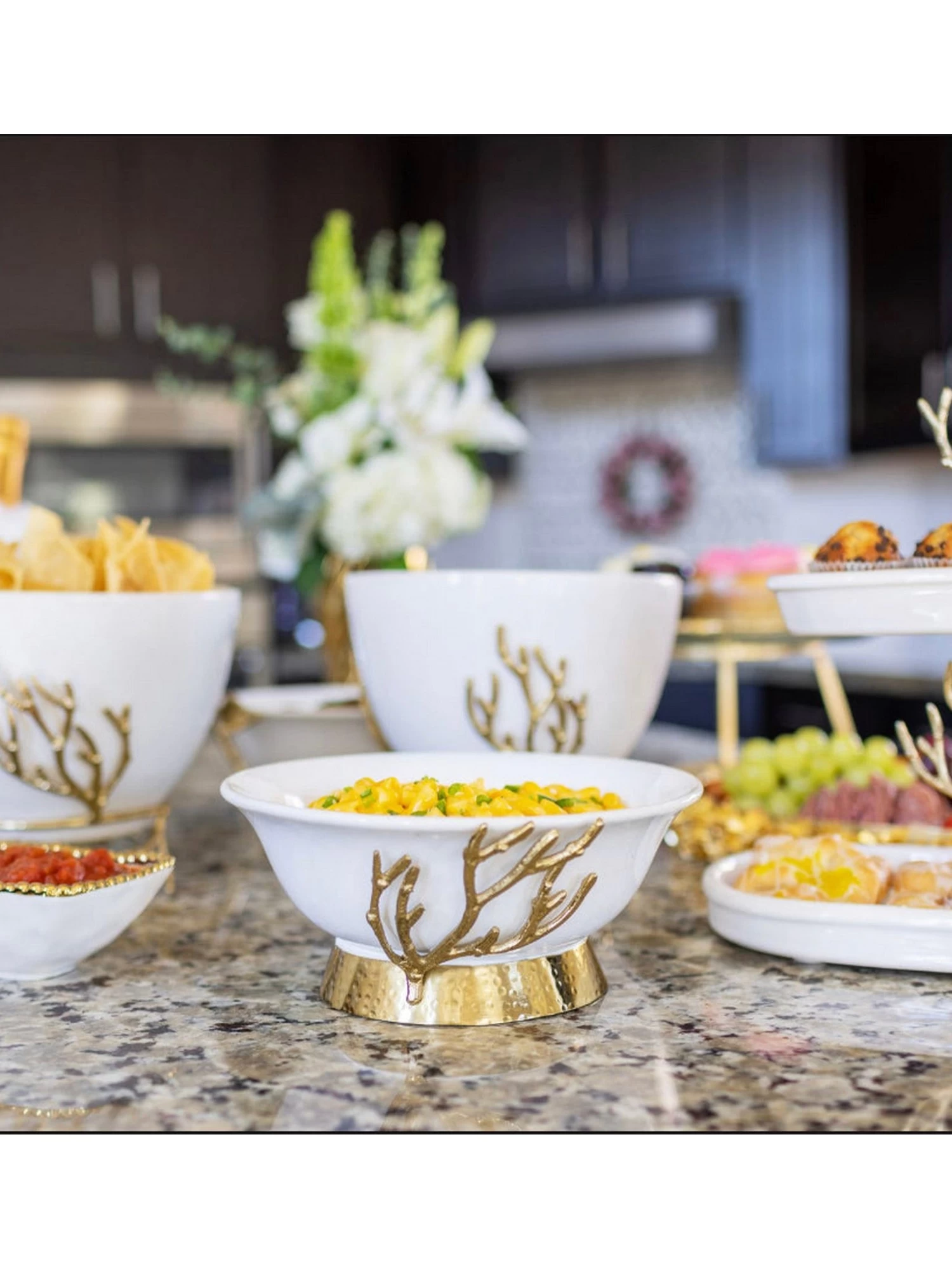 Description: This beautiful bowl is a great piece of elegant design. The gold textured details complement the glossy white ceramic to create a timeless look of sheer elegance and glam.