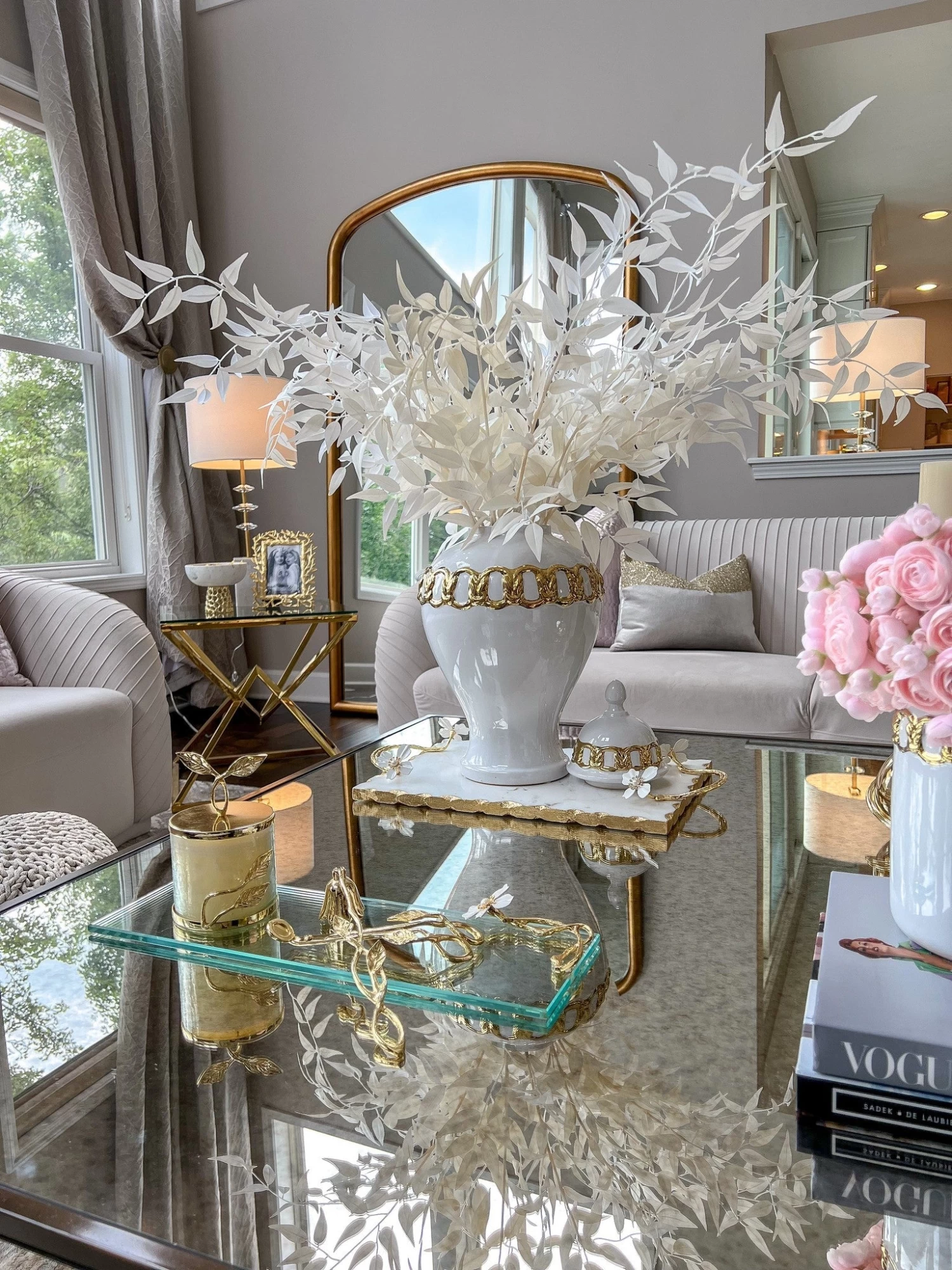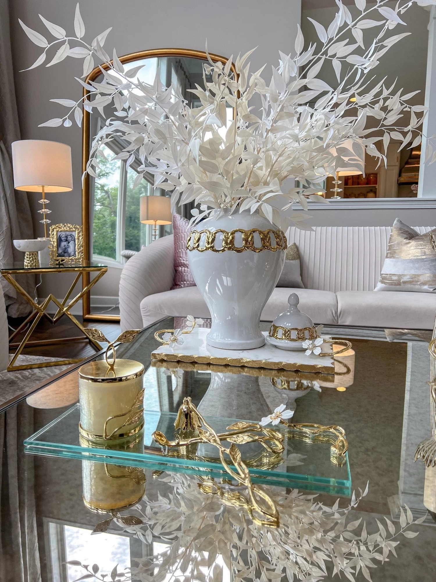 Description: These handmade stunning white ginger jars feature an intricate gold chain link design around the top and on the lid which is simple yet stunning! They are perfect to style with your favorite florals or all on their own!